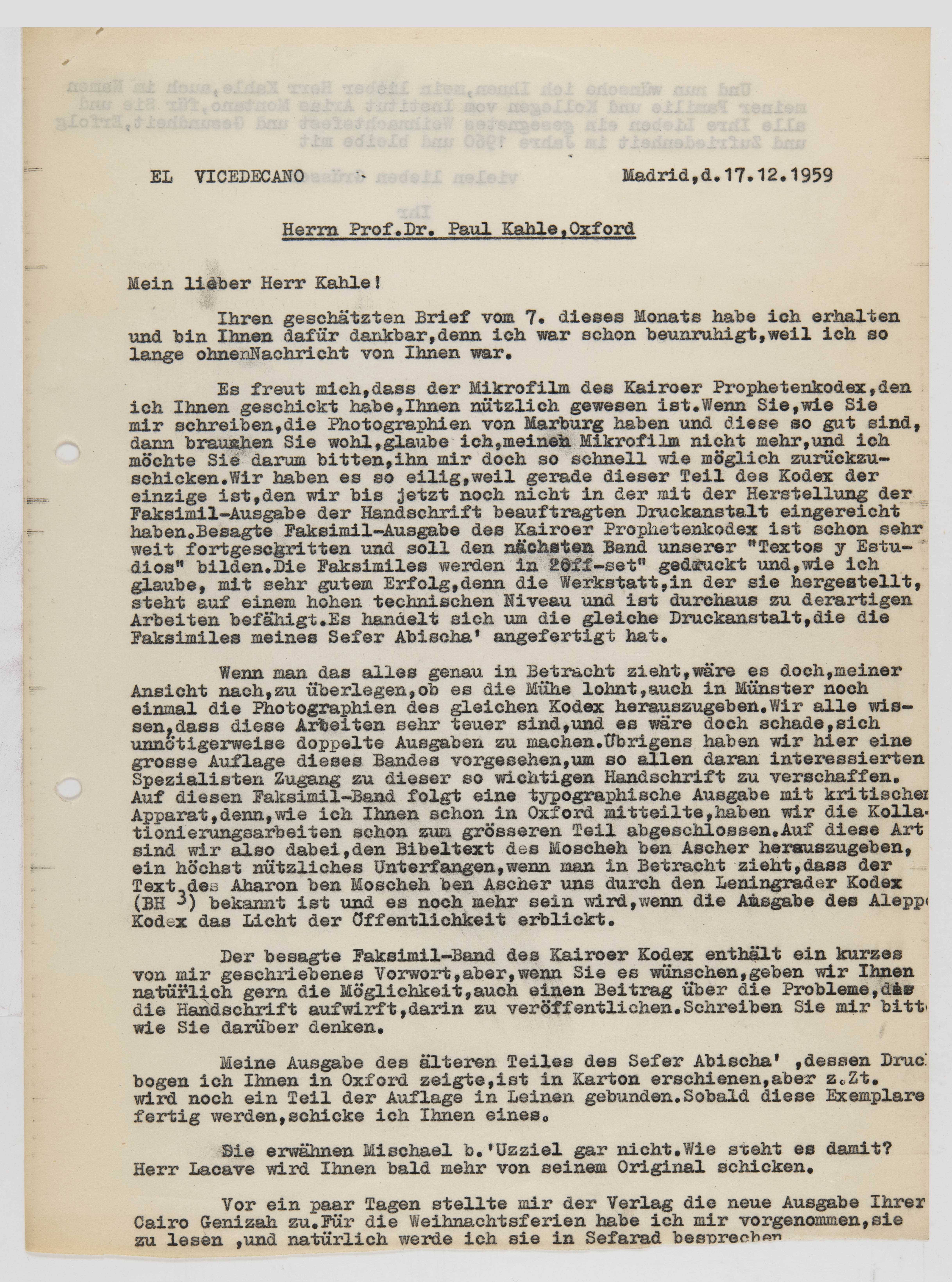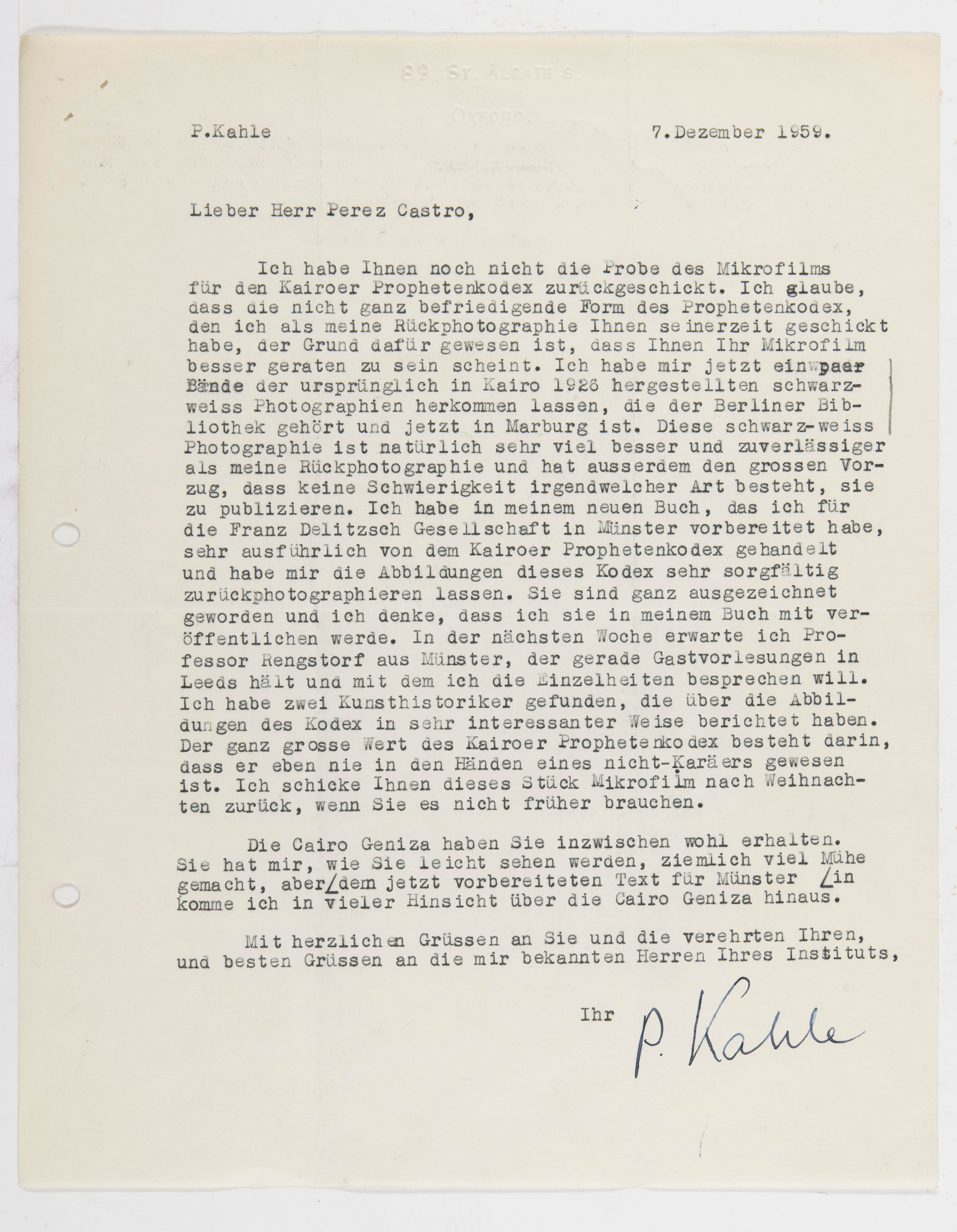 La correspondencia entre Paul Kahle y Federico Pérez Castro revela las etapas preliminares de la edición del Códice de los Profetas de El Cairo. En diciembre de 1959, intercambiaron cartas sobre los materiales esenciales para la edición: microfilmes y fotografías (Figs. 1 y 2).