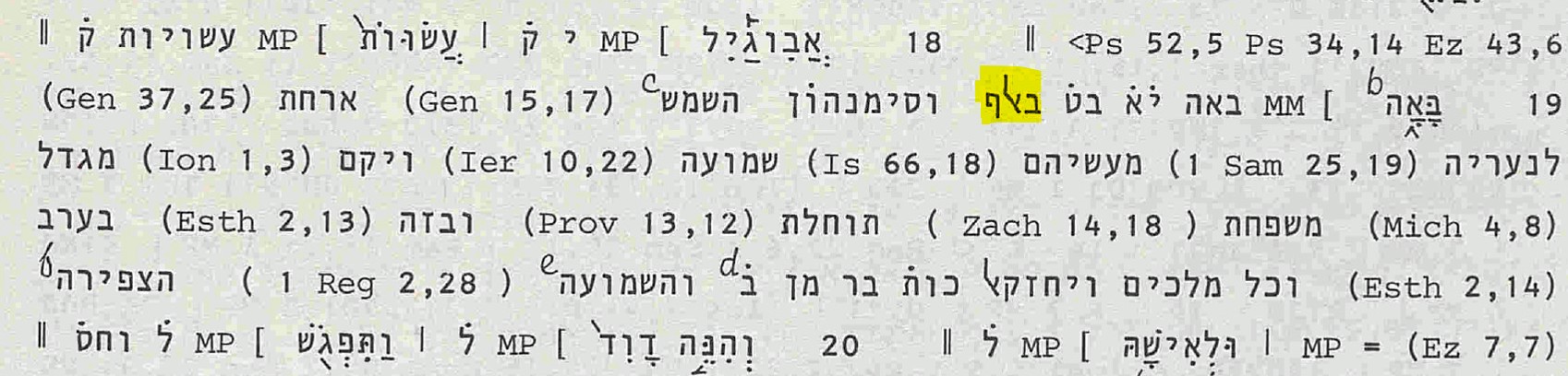 Si las anotaciones de la Masora magna y la Masora parva para el mismo lema coinciden, la Masora parva no se reproduce y se utiliza el símbolo “=” para marcar la coincidencia. Las letras en superíndice en este aparato remiten a notas explicativas al pie de la página, donde se aclaran o se elaboran algunas anotaciones.