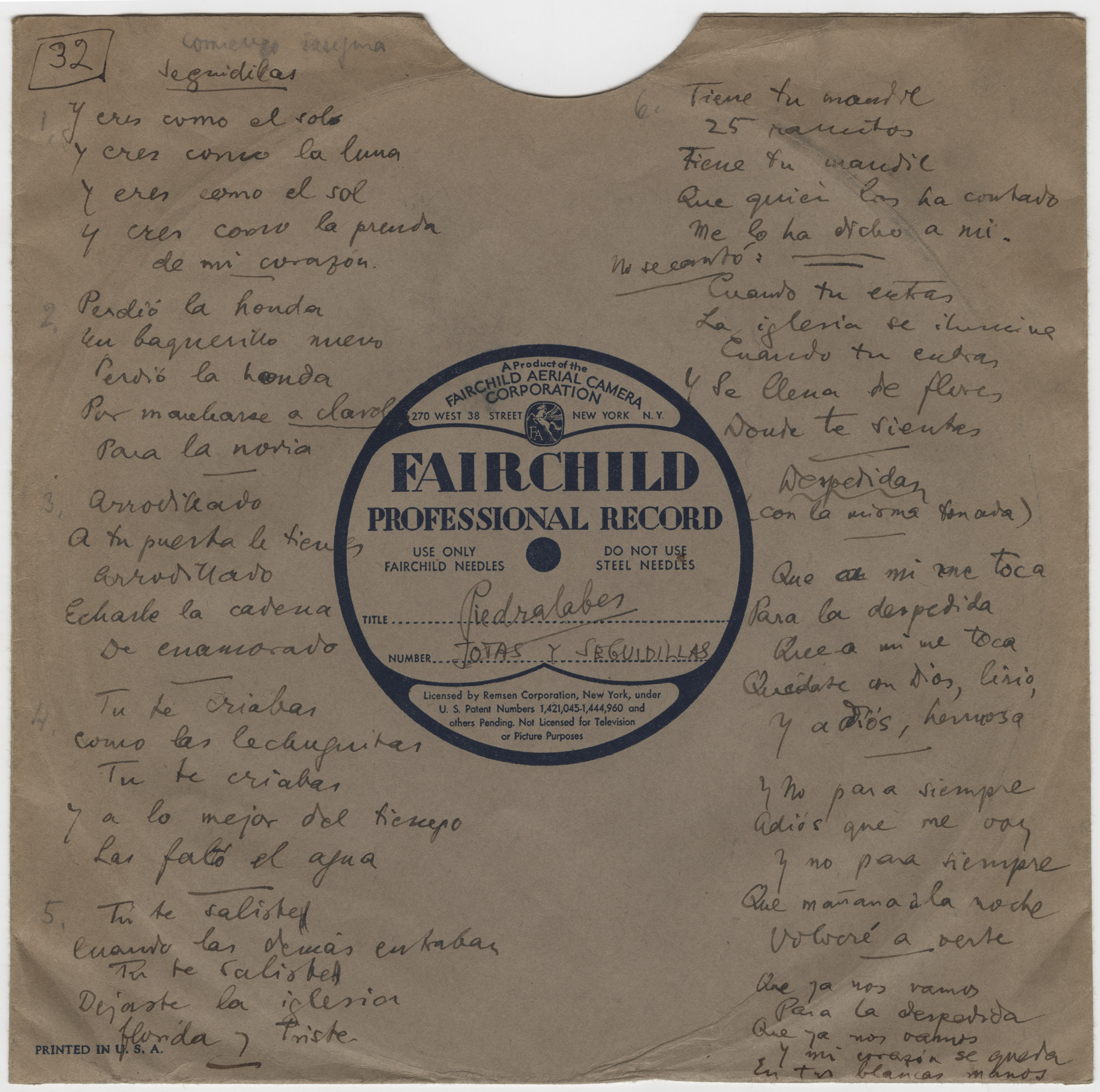 Descripción física: Disco de aluminio. Lugar y título anotado en la etiqueta del disco. En el sobre lleva manuscritas las letras de las canciones.