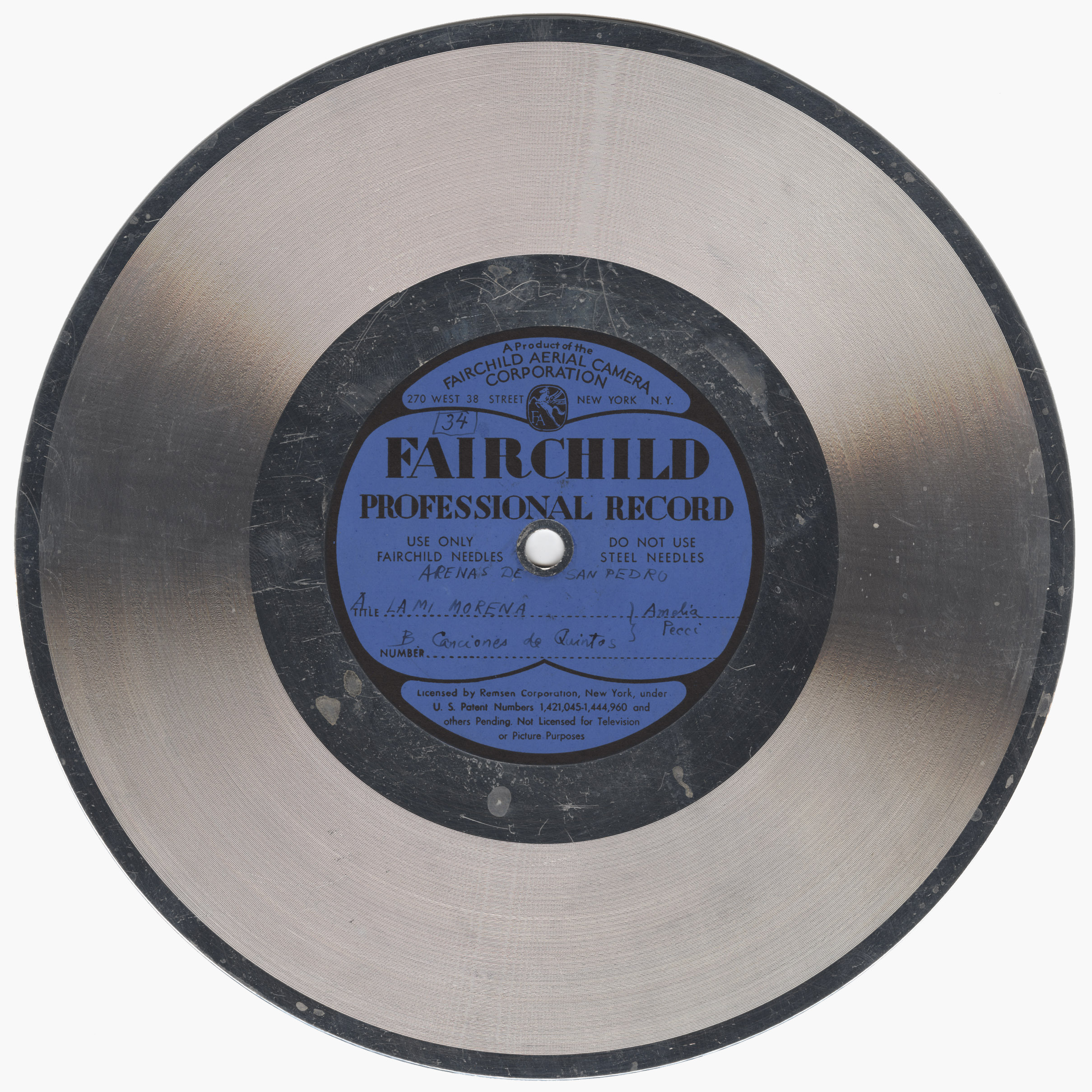 Descripción física: Disco de aluminio. En la etiqueta del disco lleva manuscritos el lugar, los títulos de las canciones y la intérprete, Amelia Pecci. En el sobre lleva las letras manuscritas.