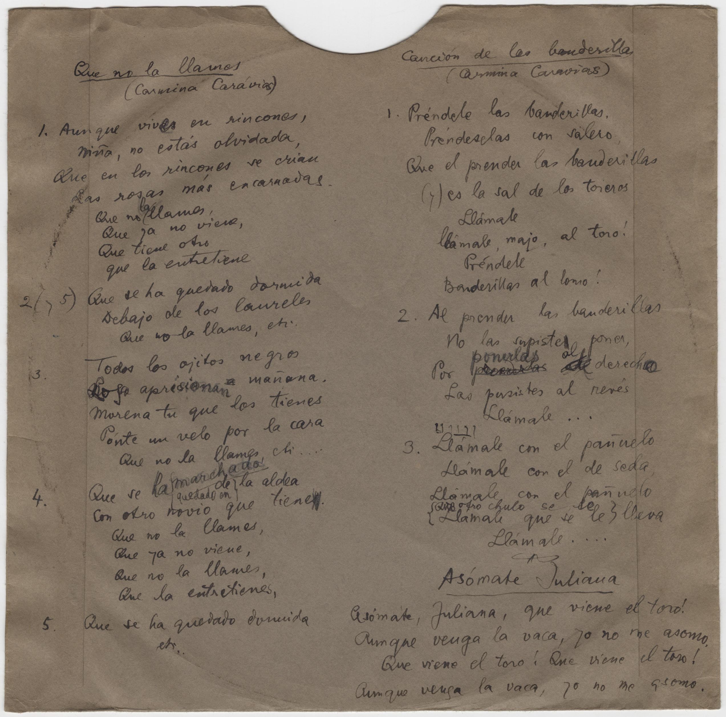Ref. Partitura transcripción Kurt Schindler (1941): A. «Que no la llames», registro número nº 37. B. «Las banderillas» y «Asómate Juliana», registros número nº 38 y nº 39