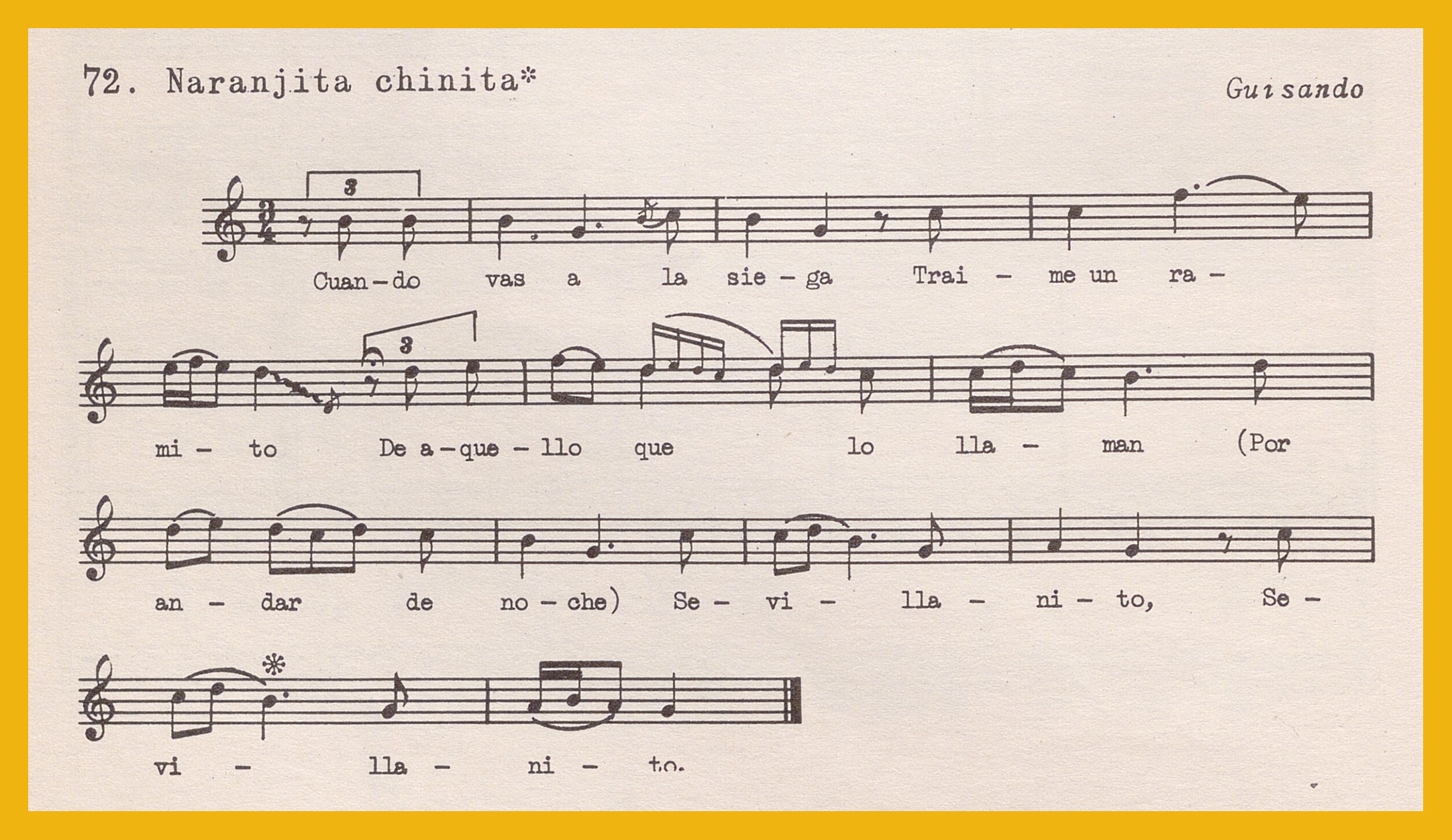 Ref. Partitura transcripción Kurt Schindler (1941): A. «El abuelo de los nabos», registro número nº 71. B. «Naranjita Chinita» y «El arretamero», registro número nº 72 y nº 73