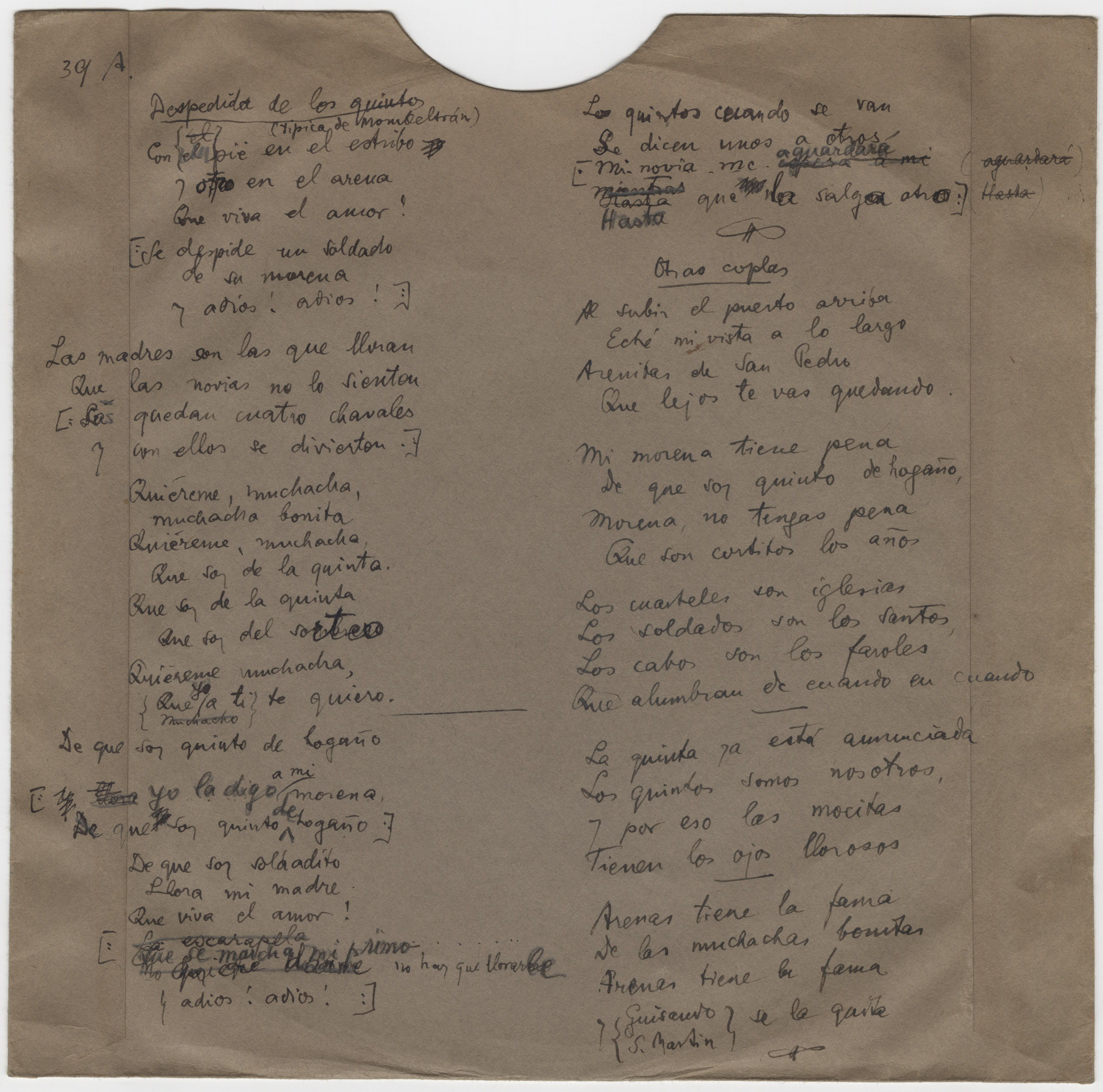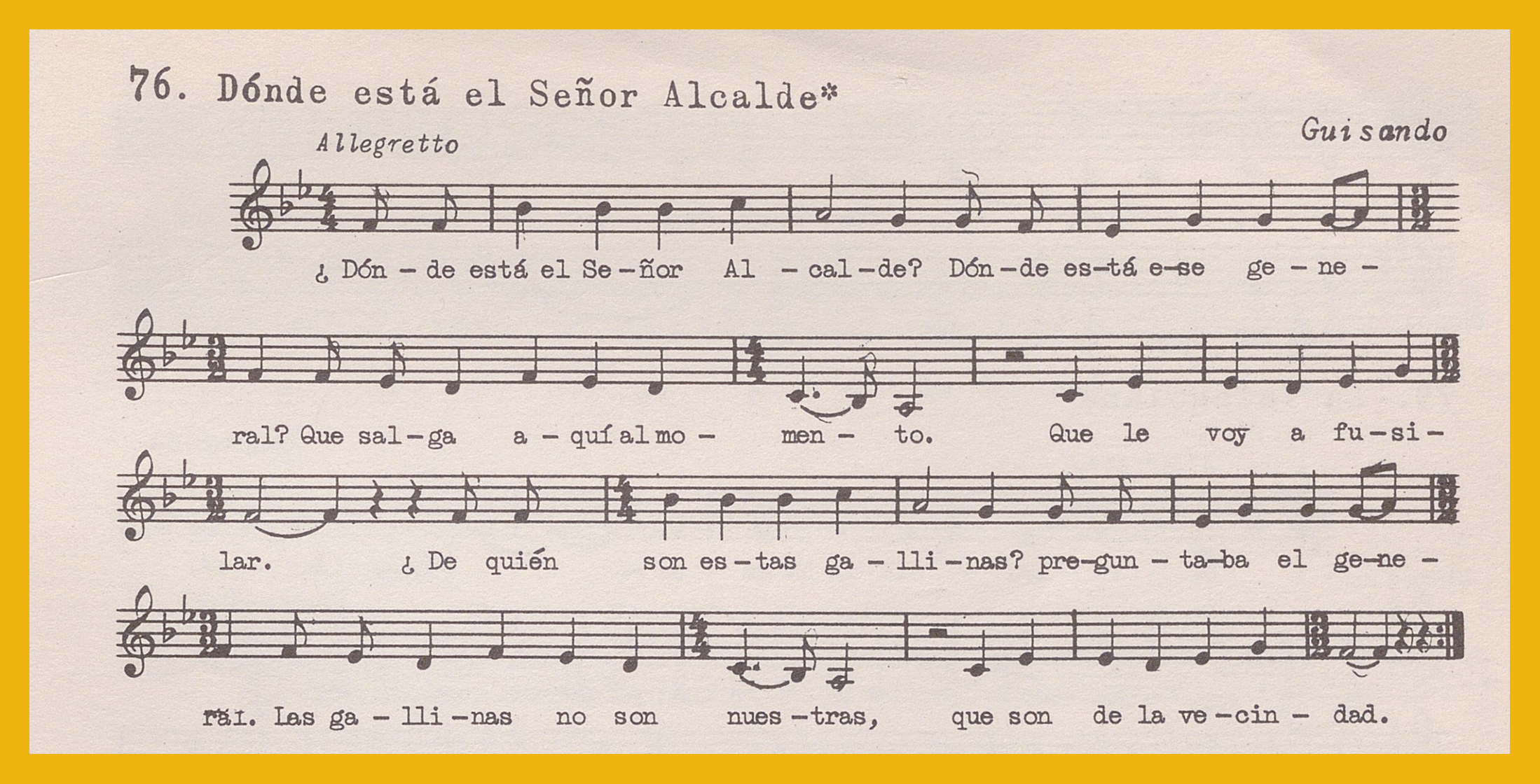 Ref. Partitura transcripción Kurt Schindler (1941): A. «Con el pie en el estribo», registro número nº 74. B. «Desde pequeñita me fui al convento» y «Donde está el Señor Alcalde», registros número nº 75 y nº 76
