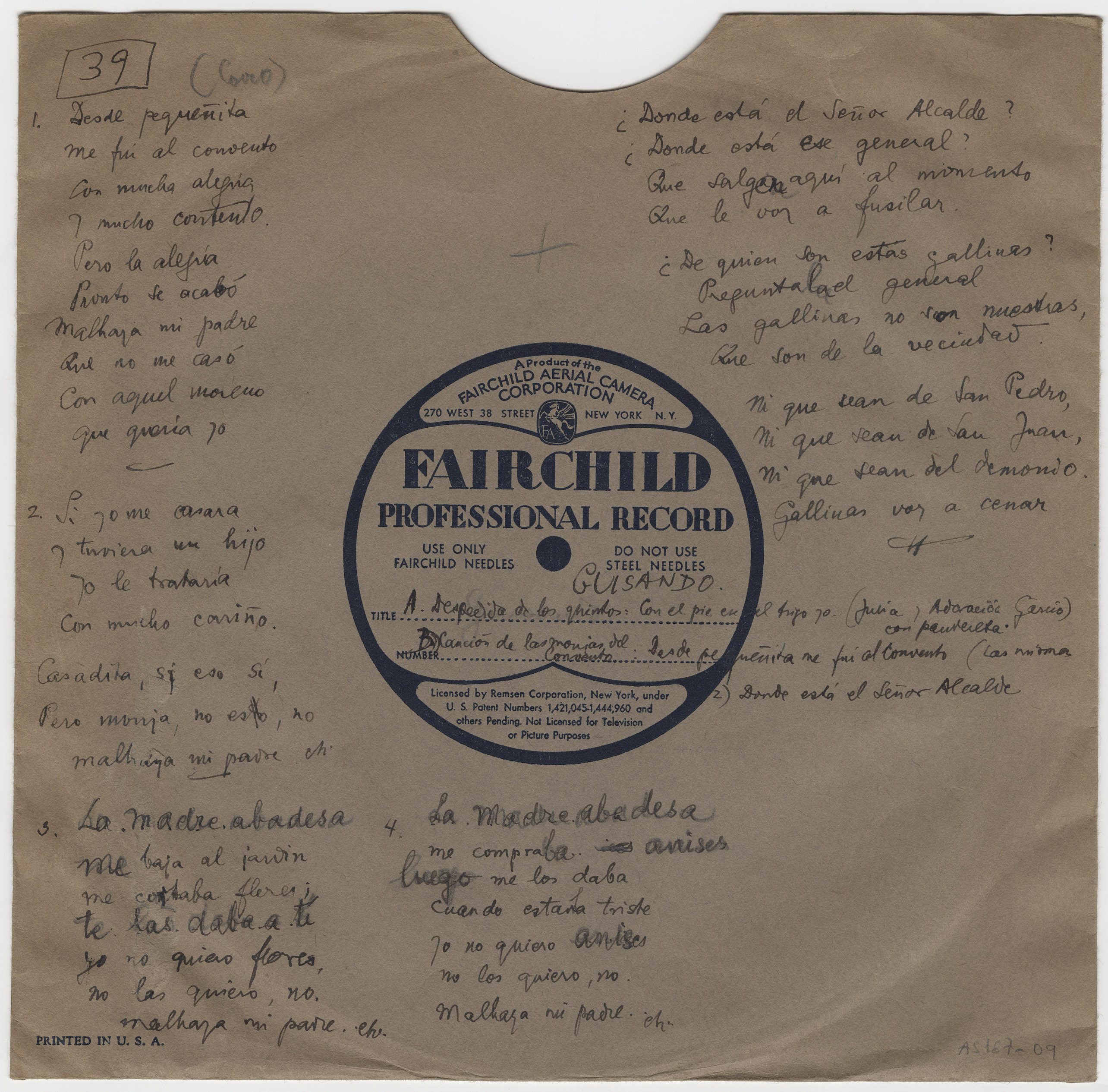 Descripción física: Disco de aluminio. En la pegatina del disco lleva manuscritos el lugar y los títulos de las canciones. En el sobre aparecen, además, las intérpretes Julia y Adoración García, y las letra de las canciones.