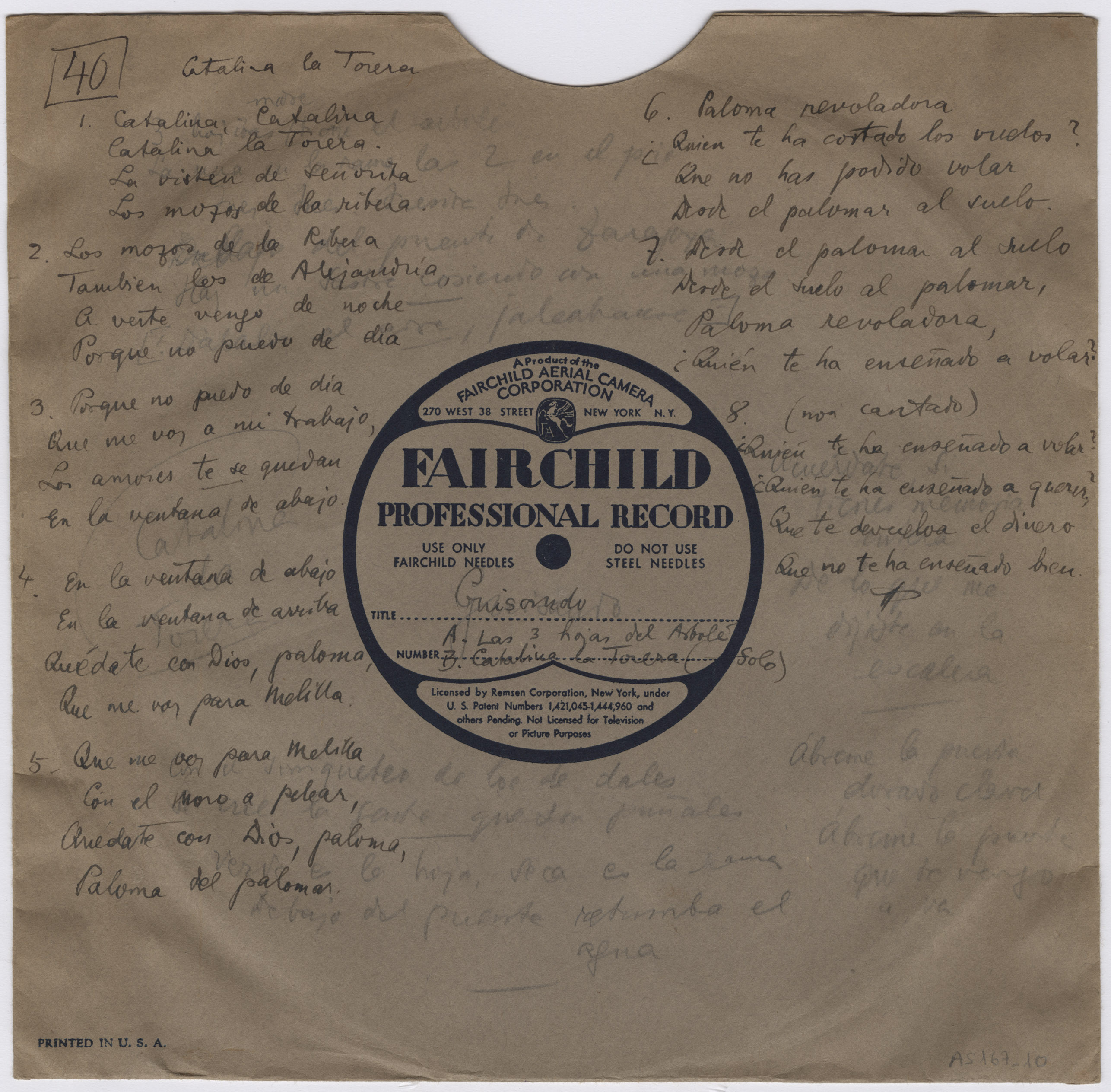 Descripción física: Disco de aluminio. En la pegatina del disco lleva manuscritos el lugar, los títulos de las canciones y las intérpretes, Julia y Adoración García. En el sobre lleva escritas en tinta las letras de las canciones, con correcciones y notas escritas a lápiz.