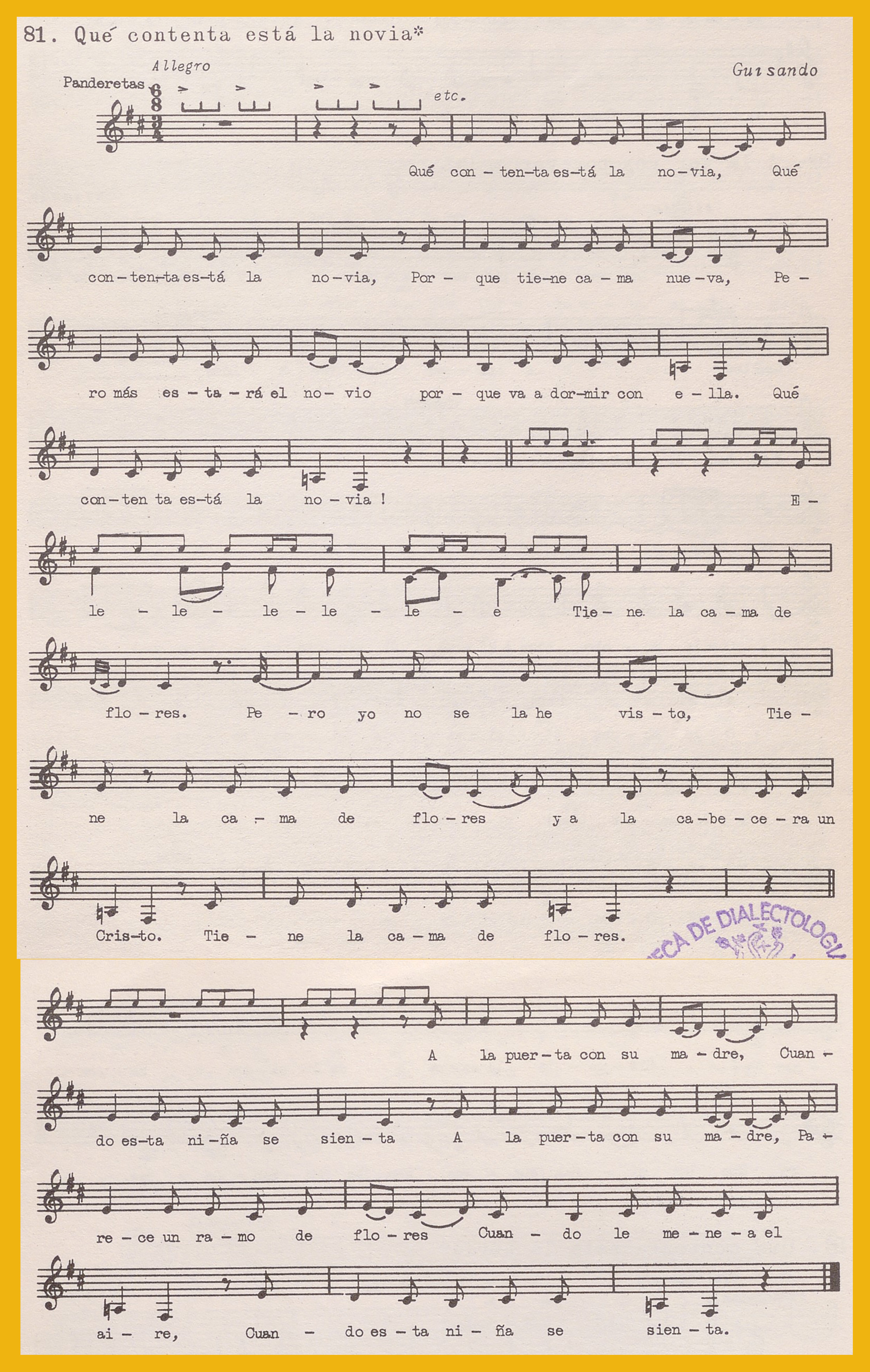 Ref. Partitura transcripción Kurt Schindler (1941): A. «Qué contenta está la novia», registro número nº 81. B. «A la mar me voy por ver agua», registro número nº 82