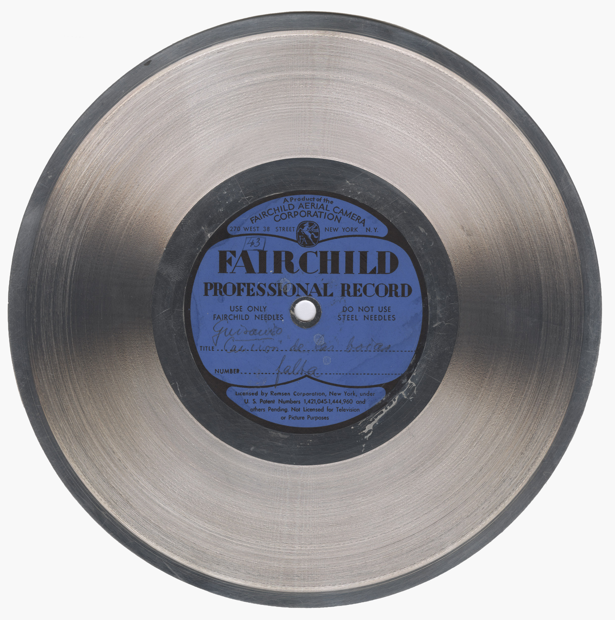 Descripción física: Disco de aluminio. En la pegatina del disco lleva manuscritos el lugar y el título. En el sobre lleva manuscritas, además, varias estrofas de la canción y algunas notas a lápiz en el recto y la letra completa en tinta por el verso.