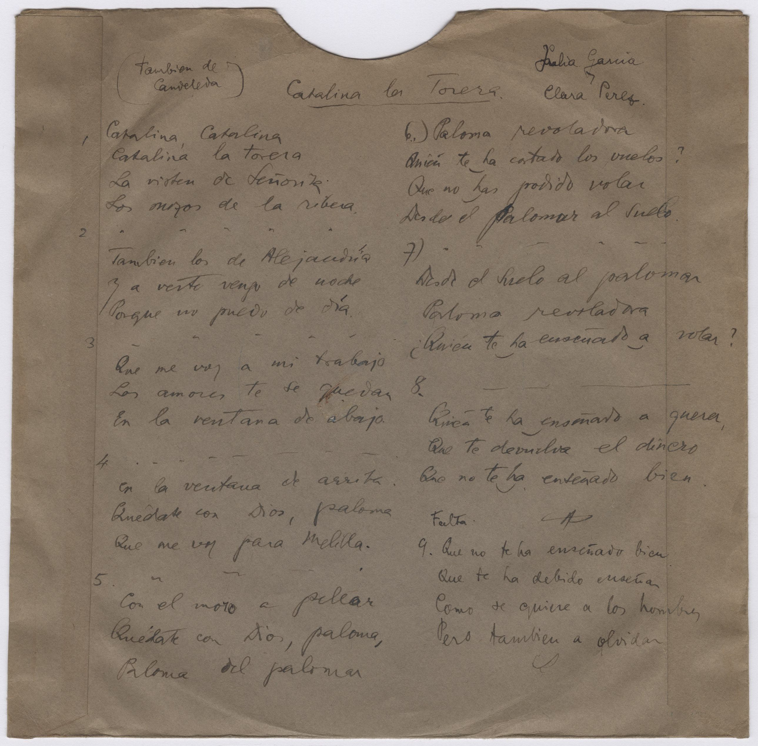Descripción física: Disco de aluminio. En la pegatina del disco lleva manuscritos el lugar y los títulos de las canciones. En el sobre lleva manuscritas las letras de las canciones y las intérpretes: de las jotas, Julia García, y de Catalina la Torera, Julia García y Clara Pérez.