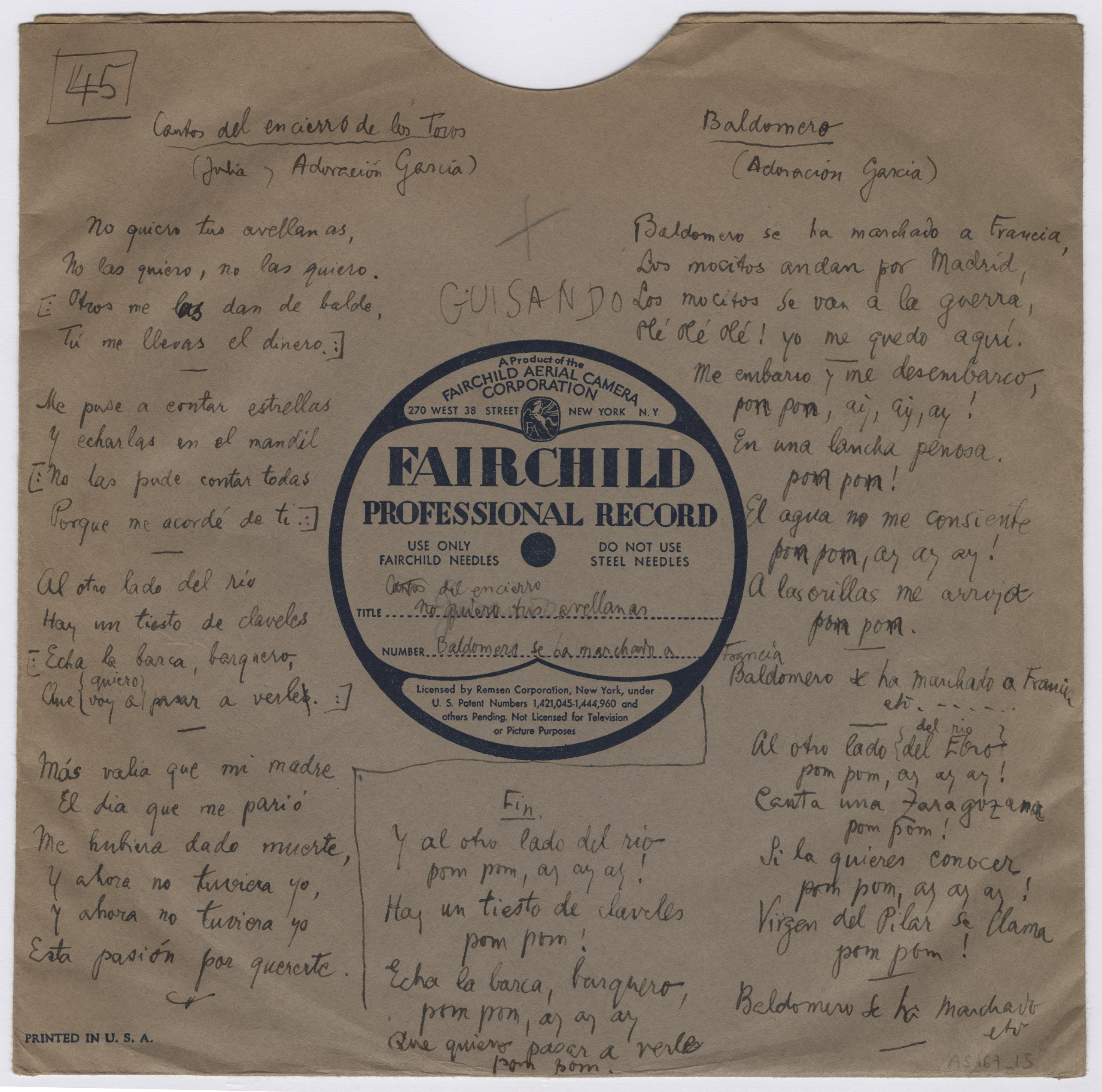 Descripción física: Disco de aluminio. En la pegatina del disco lleva manuscritos los lugares y los títulos de las canciones. En el sobre lleva manuscritas las letras de las canciones y las intérpretes: Julia y Adoración García.