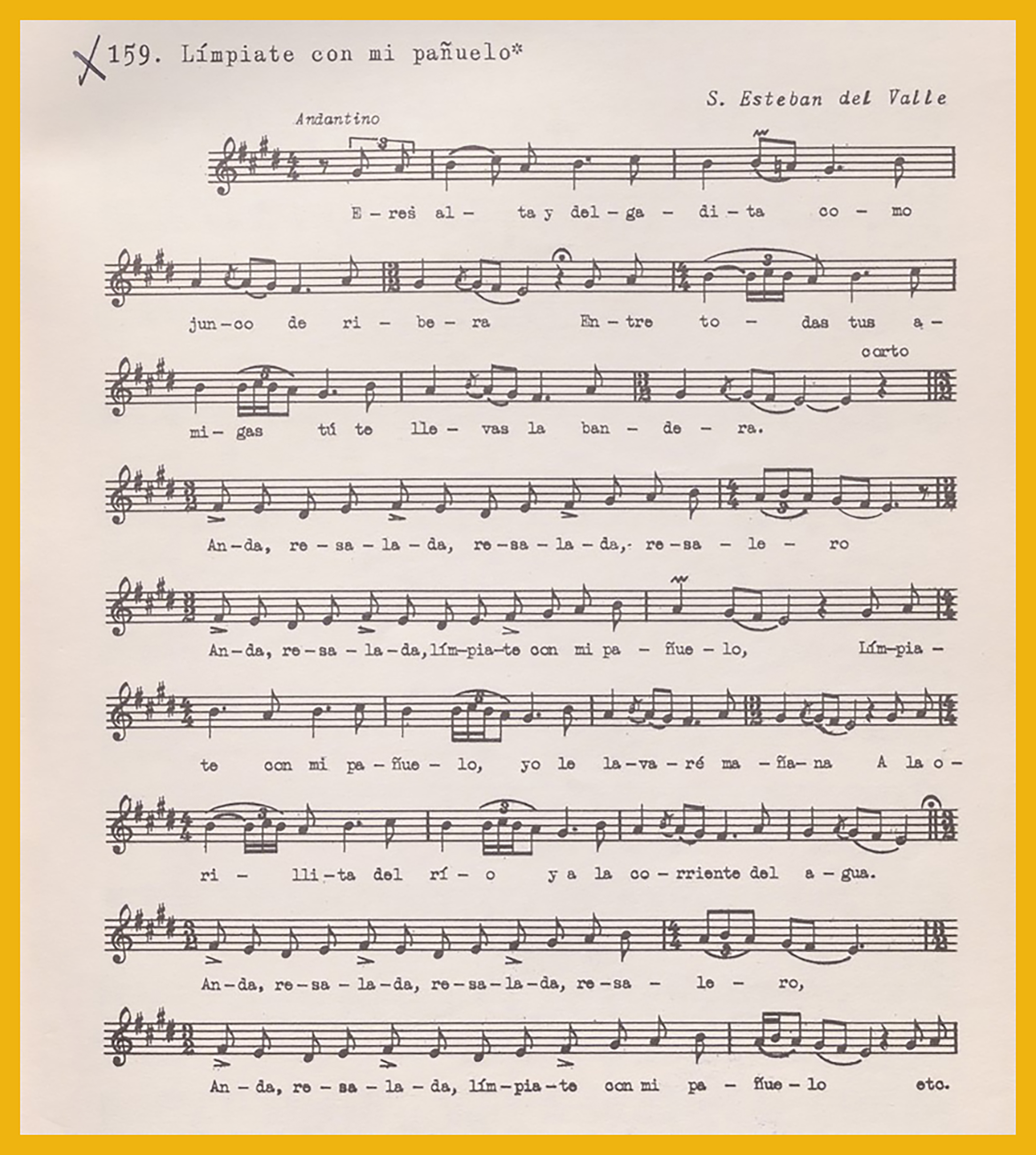 Ref. Partitura transcripción Kurt Schindler (1941): A. «Límpiate con mi pañuelo», registro nº 159. B. «Aquí torito valiente (Canción del torito)», registro nº 160