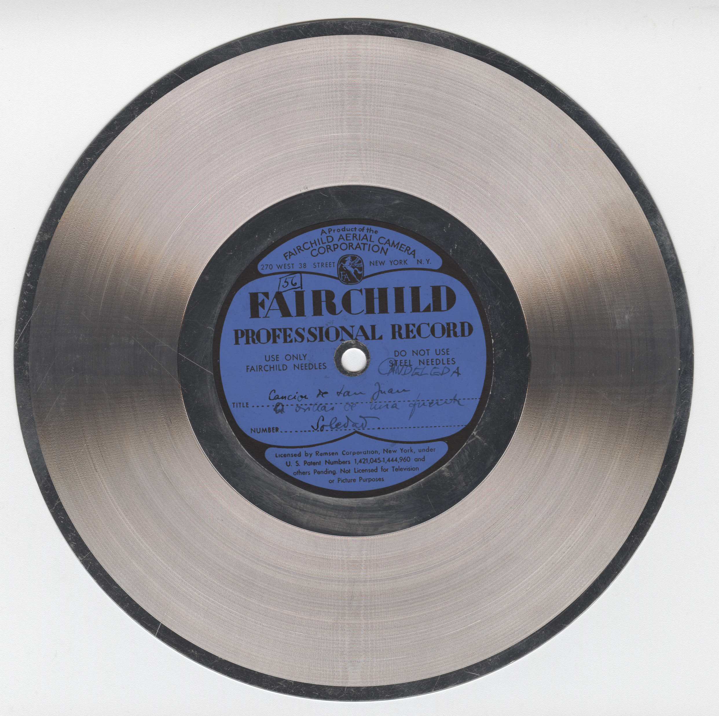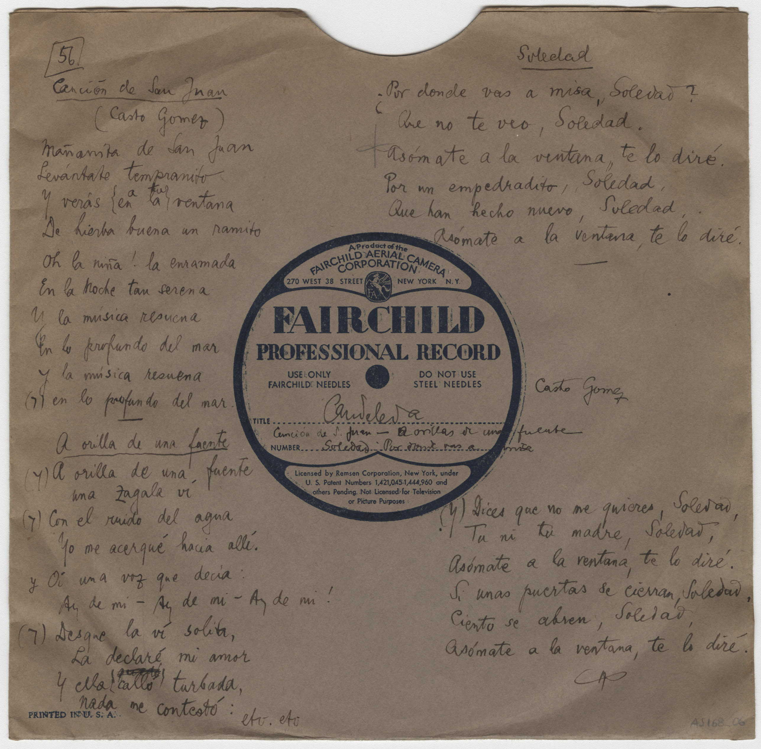 Descripción física: Disco de aluminio. En la etiqueta del disco lleva manuscritos el lugar y los títulos de las canciones. En el sobre lleva escritas las letras y el intérprete, Casto Gómez.
