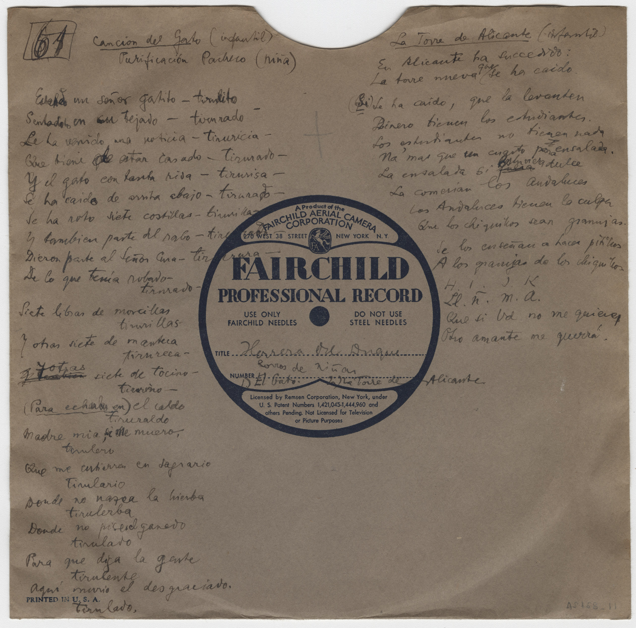 Marca comercial: Fairchild Professional Record (Fairchild Aereal Camera Corporation, New York).