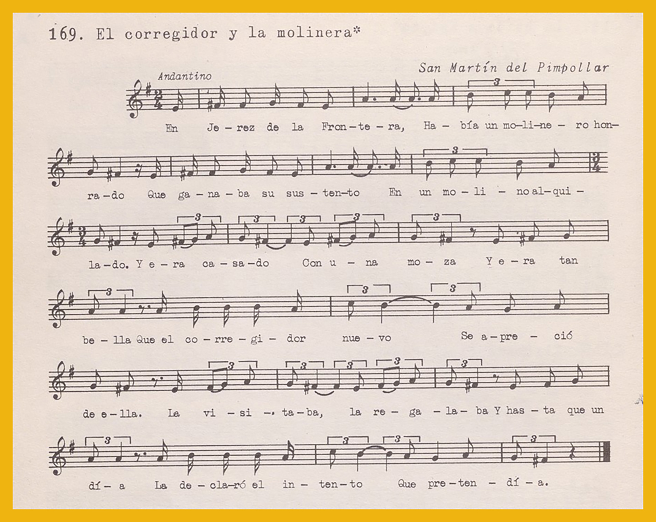 Ref. Partitura transcripción Kurt Schindler (1941): A. «Zagalita venturosa», registro nº 165. «La loba parda (romance)», registro nº 166. «Huida a Egipto», registro nº 167. B. «El Conde Flor», romance con arrabel (sic), registro nº 168. «El corregidor y la molinera», registro 169. «El corregidor y la molinera (versión mejor)», registro nº 170