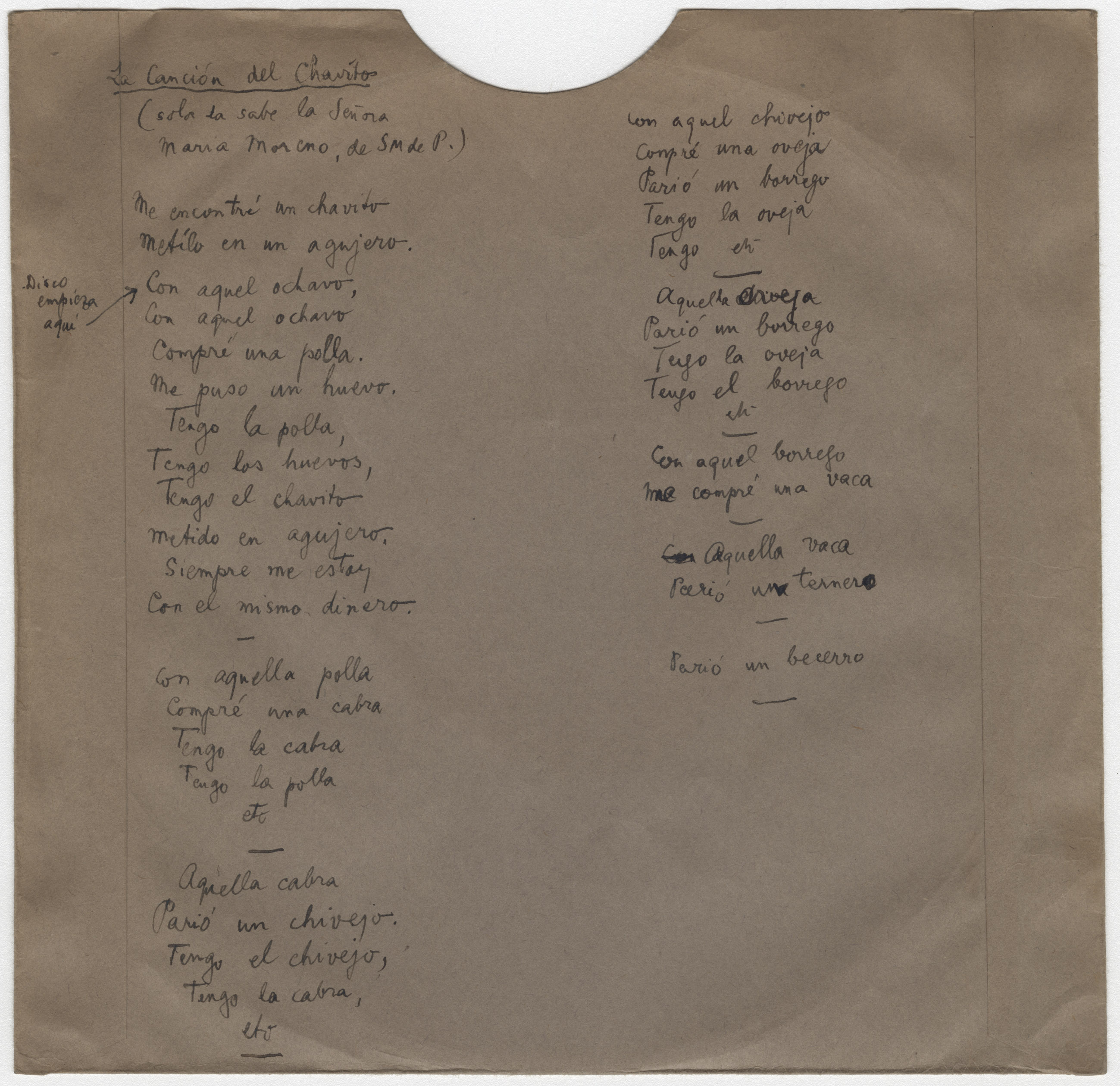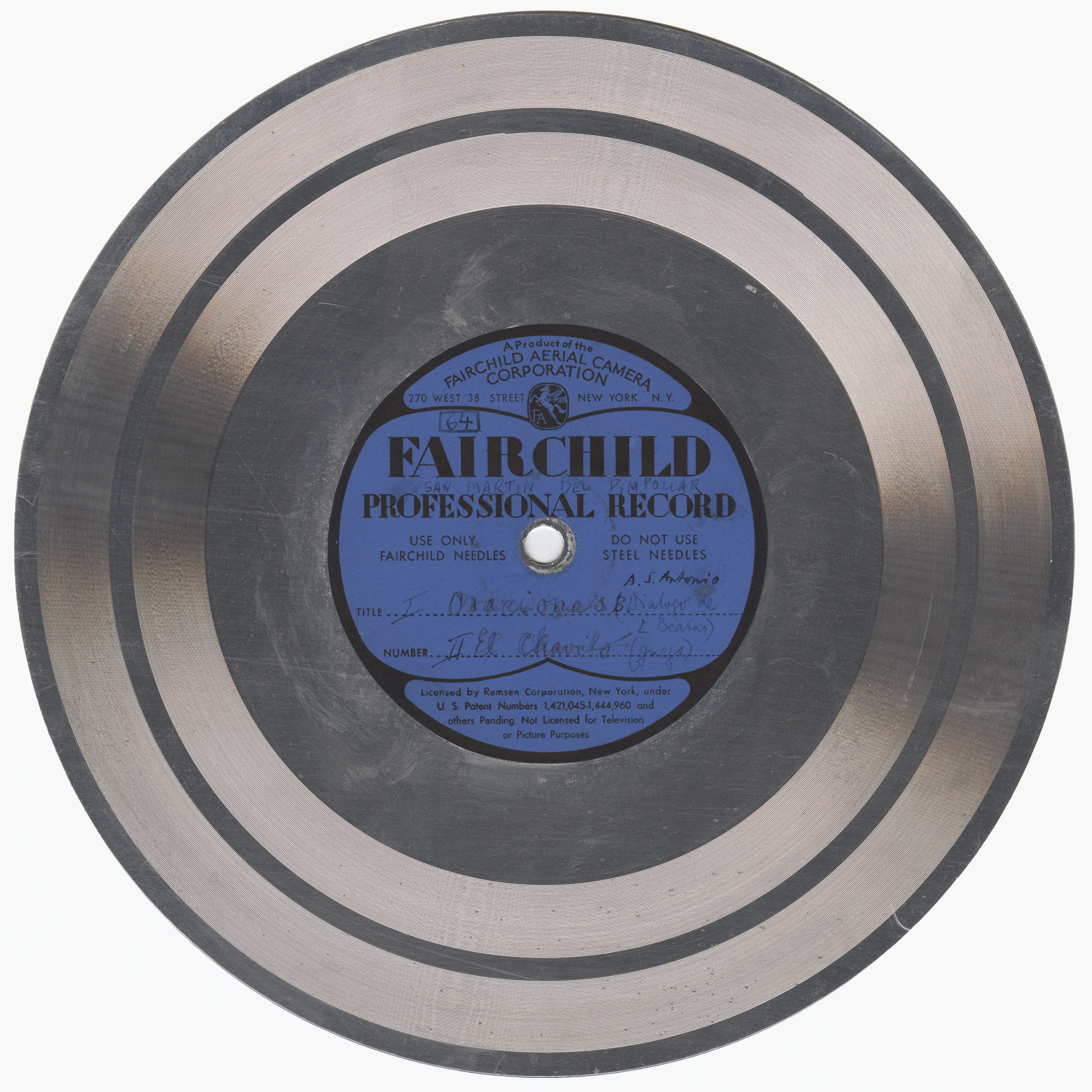 Descripción física: Disco de aluminio. En la etiqueta del disco lleva manuscritos el lugar y los títulos de las canciones, y en el sobre lleva las letras de las canciones: Responso de San Antonio, Parlamento de Dos Beatas y la Canción del Chavito. En la última se indica que solo la sabe la Señora María [sic] Moreno.