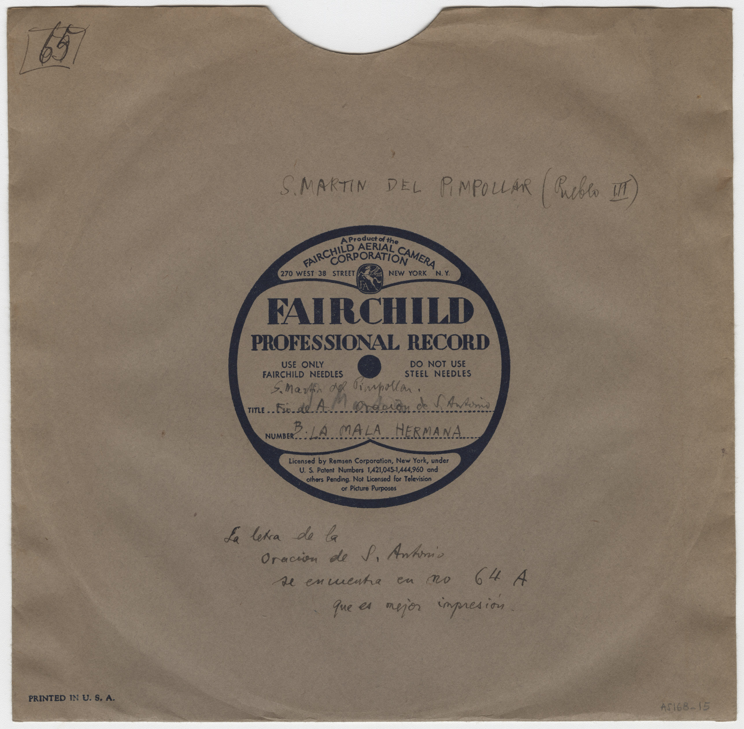 Descripción física: Disco de aluminio. En la etiqueta del disco lleva manuscritos el lugar y los títulos de las canciones. En el sobre lleva la letra de la segunda canción, la intérprete, Bonifacia Martín, y una nota: La letra del primer registro en la cara A, se encuentra en el disco 64A, que es mejor impresión.