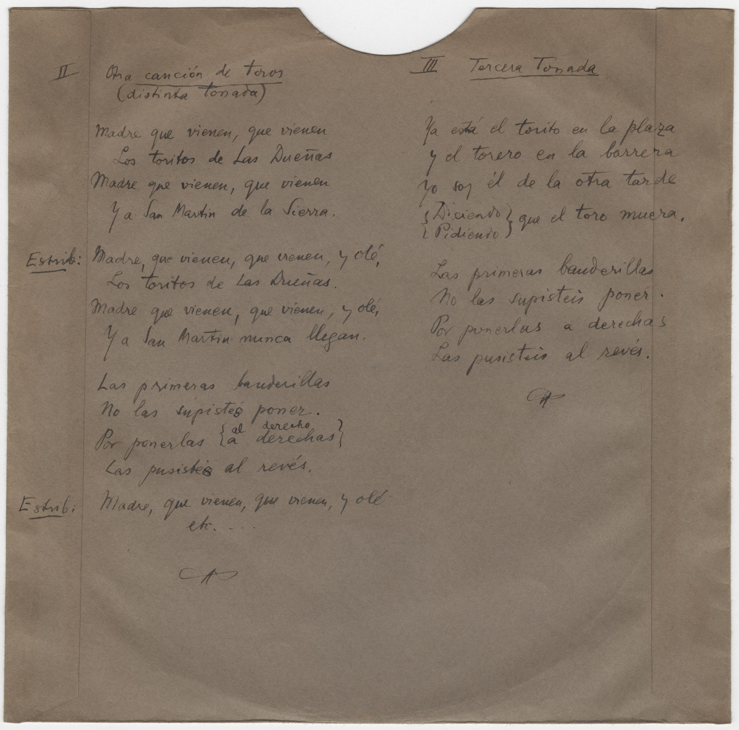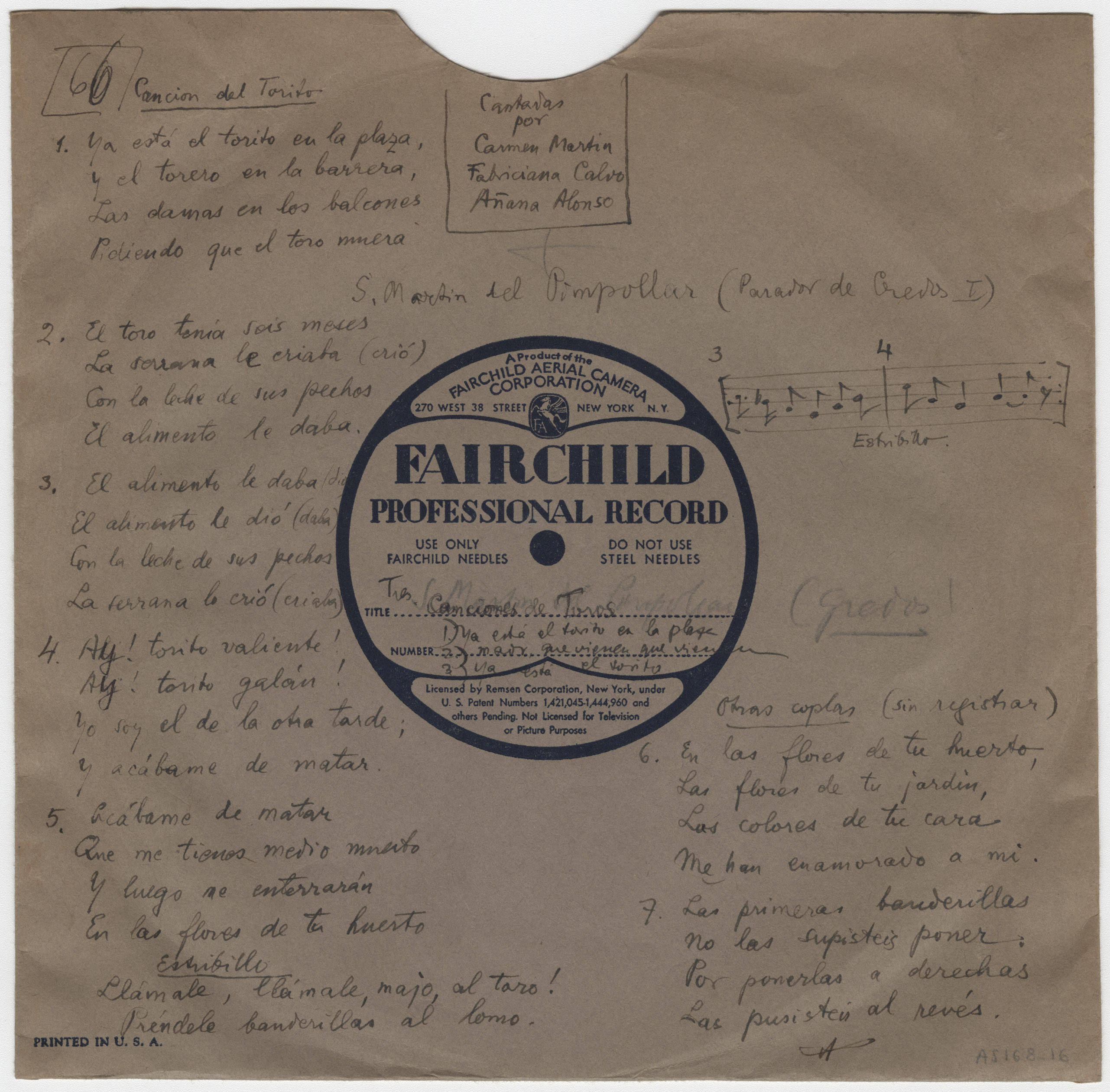 Descripción física: Disco de aluminio. En la etiqueta del disco lleva manuscritos el lugar y los títulos de las canciones. En el sobre lleva las letras, las intérpretes, letras de coplas sin registrar y un pentagrama del estribillo.