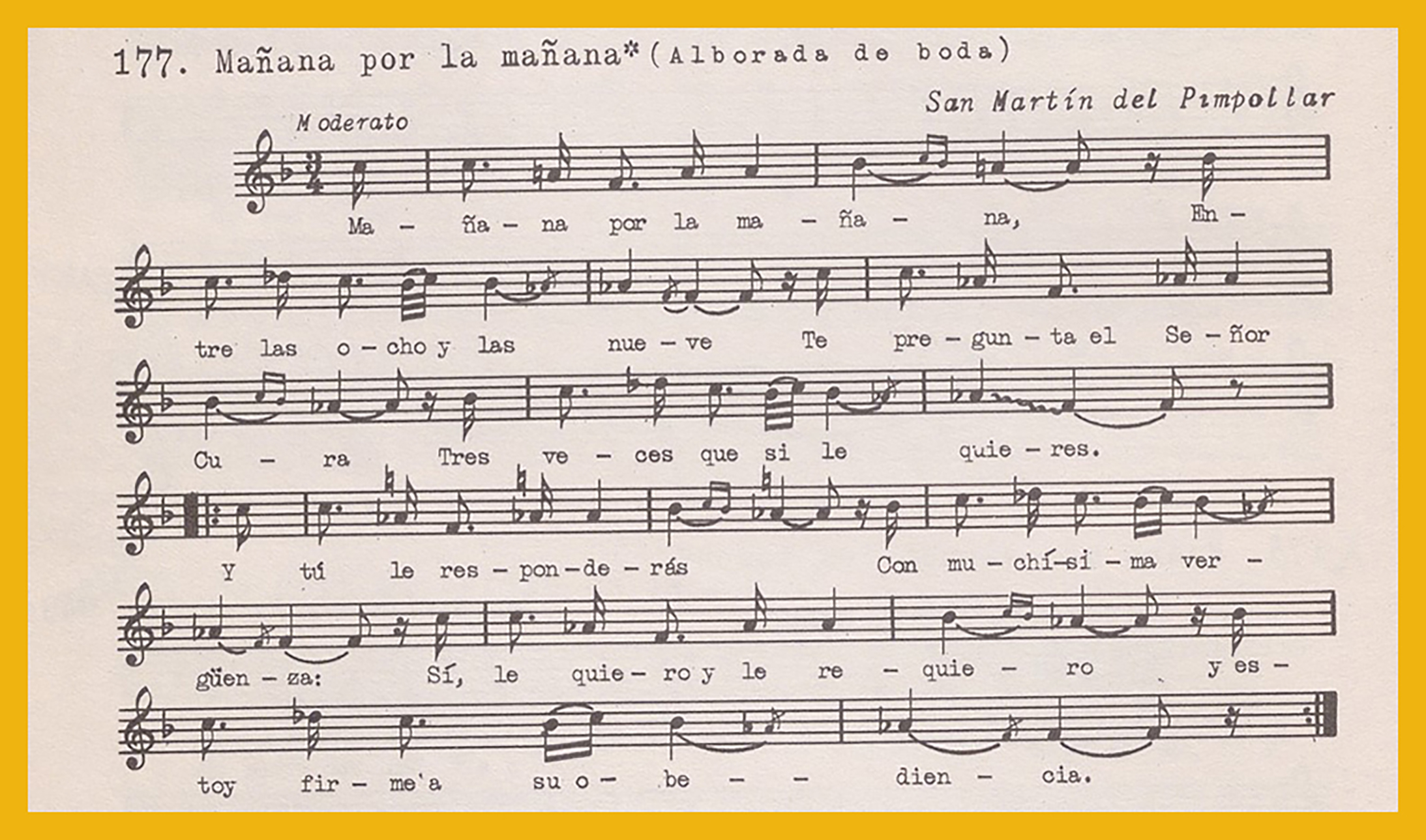 Ref. Partitura transcripción Kurt Schindler (1941): A. «Has de echar mi bienllegada (Alborada de boda)», registro nº 176. «Mañana por la mañana (Alborada de boda)», registro nº 177
