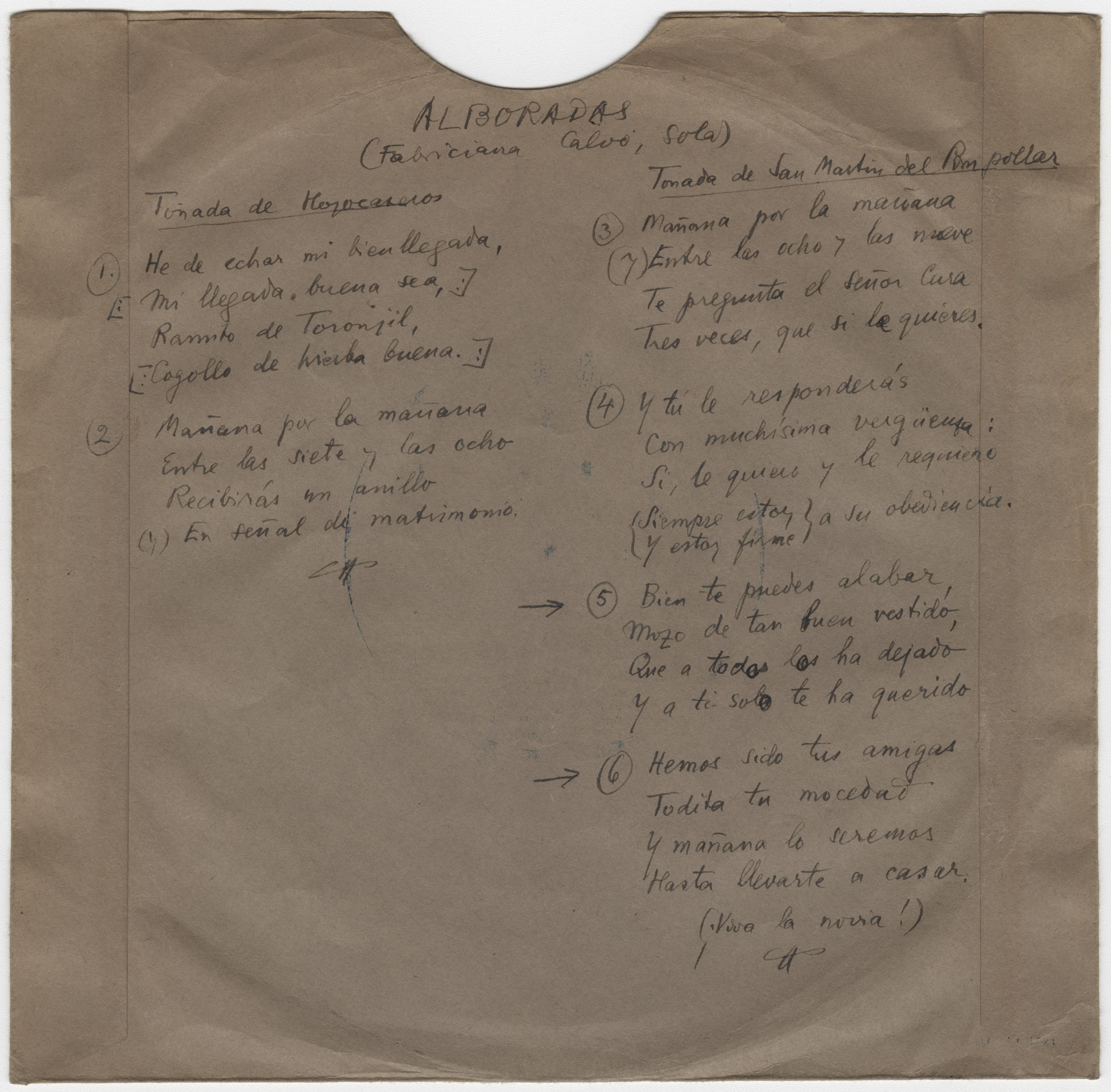 Descripción física: Disco de aluminio. En la etiqueta del disco lleva manuscritos, los lugares, el título y la intérprete. En el sobre lleva las letras de las dos tonadas.