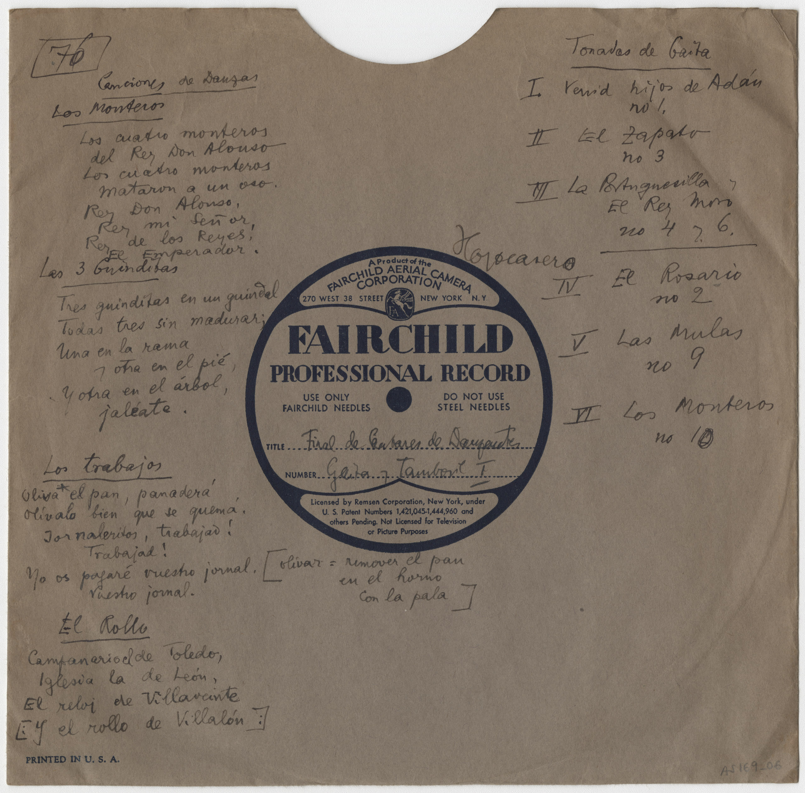 Descripción física: Disco de aluminio. En la etiqueta del disco lleva manuscrito lugar y los títulos. En el sobre lleva escritas las letras de las canciones de danzantes y los títulos de las tonadas. Las canciones están interpretadas por Sanie López " El gracioso" aunque no figure en el disco.