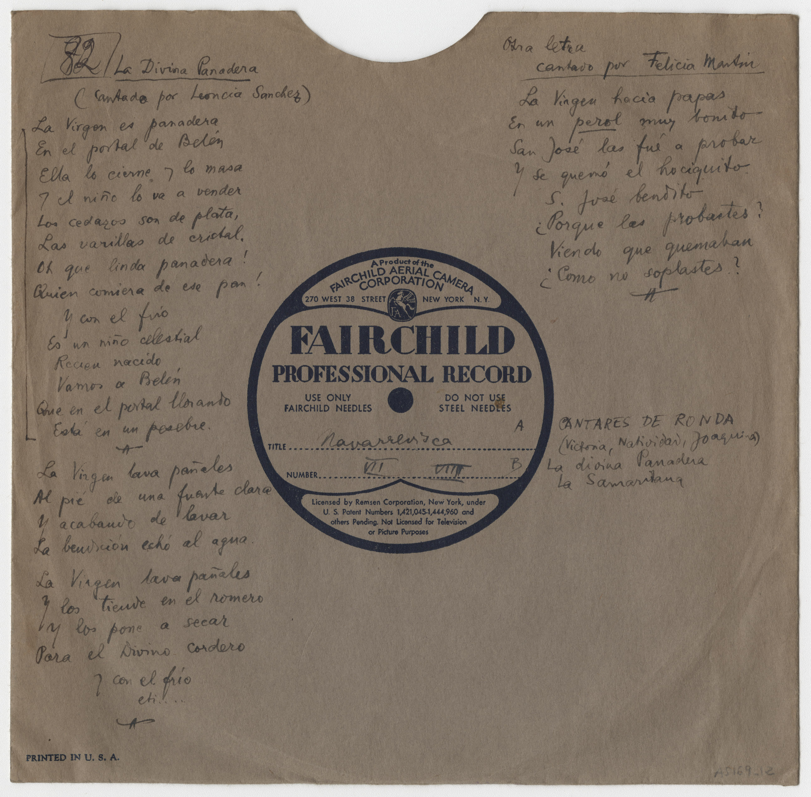 Descripción física: Disco de aluminio. En la etiqueta del disco lleva manuscrito el lugar y los títulos de las canciones, y en el sobre las letras de las canciones y los nombres de las intérpretes. Va acompañado de dos cuartillas con la letra completa de los Cantares de ronda, de sacramentos y de despedida.