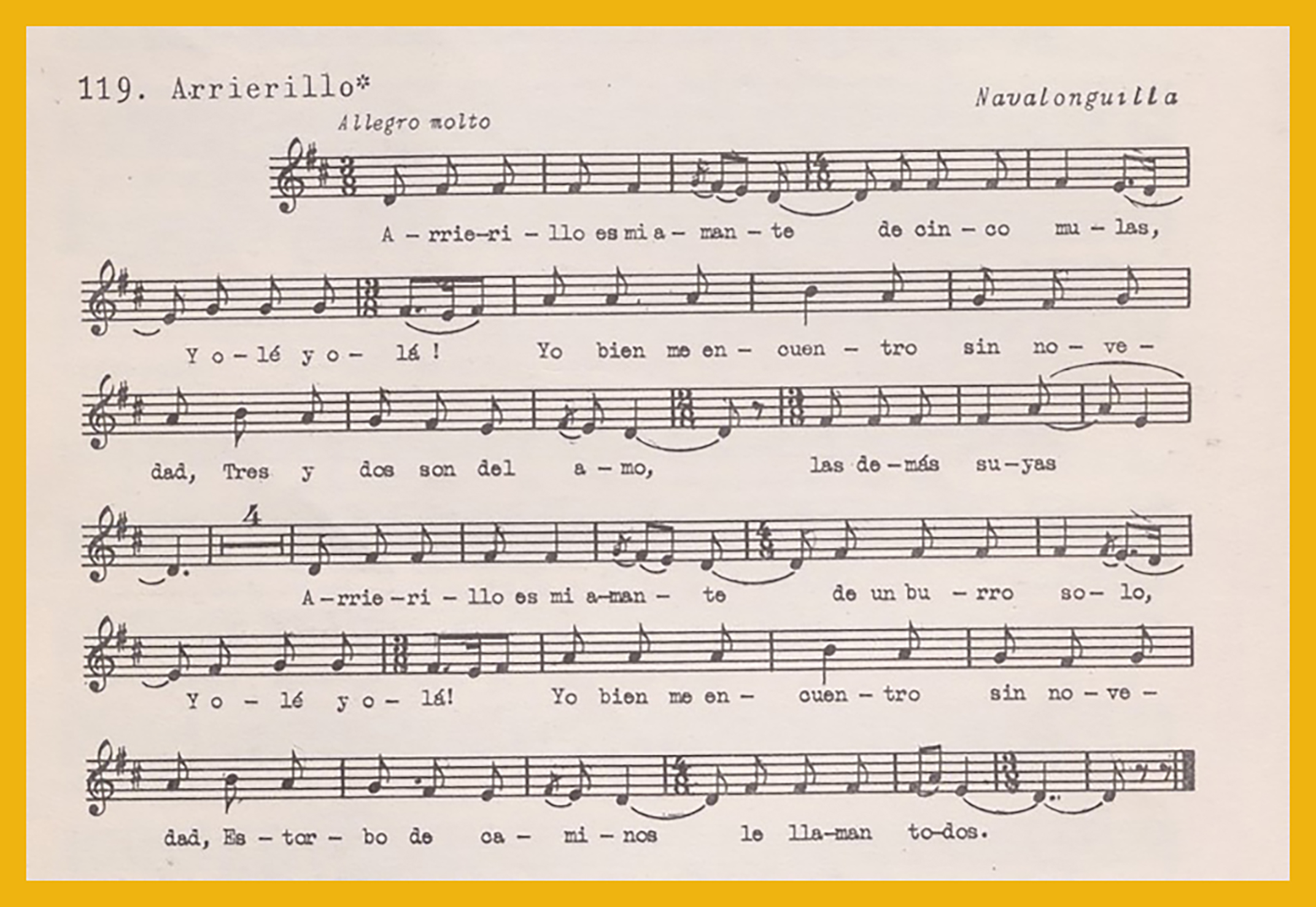 Ref. Partitura transcripción Kurt Schindler (1941): A «Arrierillo», registro número 119. «Vengo de moler», registro número 120. B. «Cómo se menea», registro número 121. «La rama de laurel», registro número 122