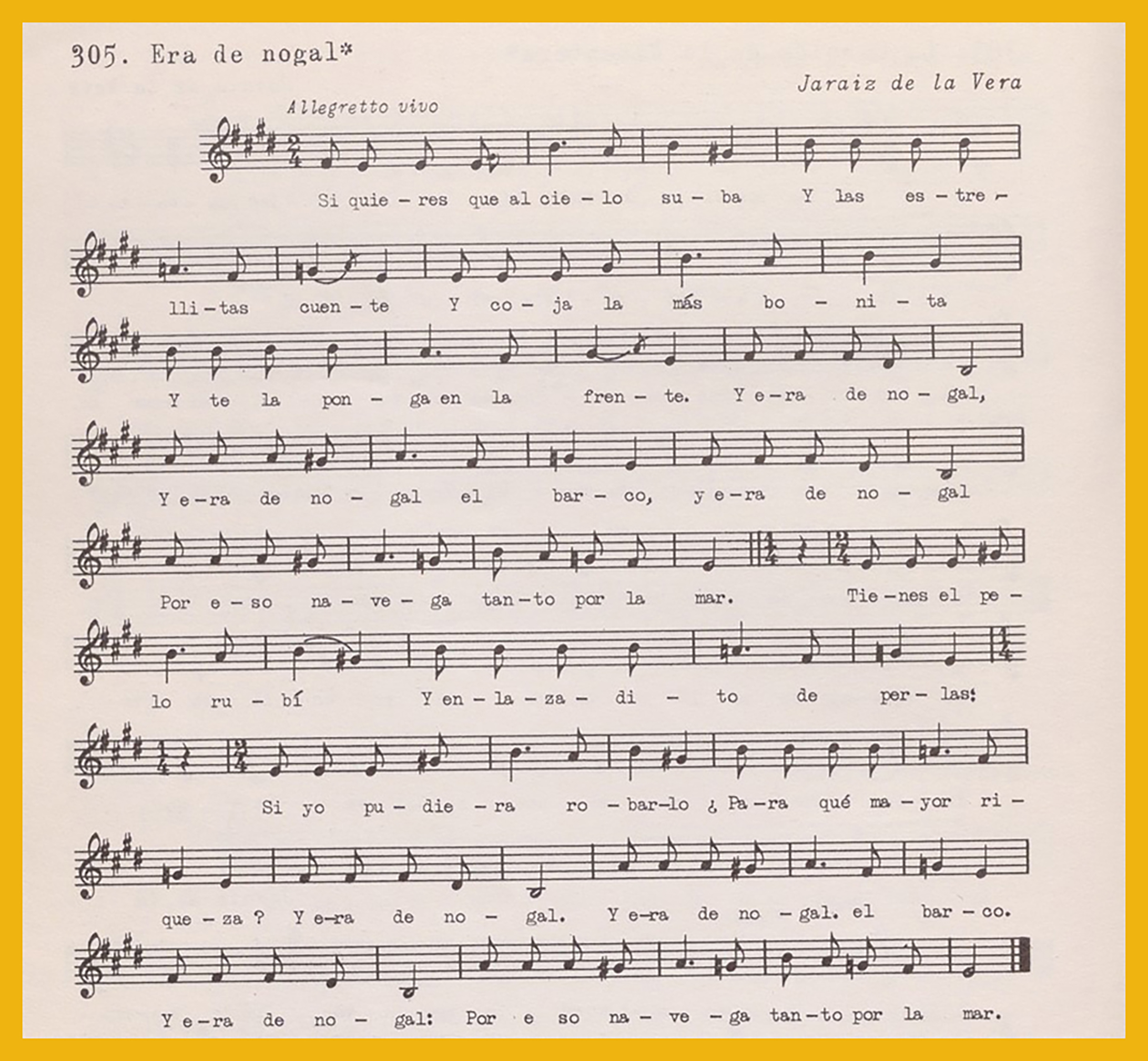 Ref. Partitura transcripción Kurt Schindler (1941): « El pájaro ya voló», registro número 376. « Tráeme majito un peine», registro número 297. B. «Era de nogal», registro nº 305. «Jotitas de la Vera», registro número 306