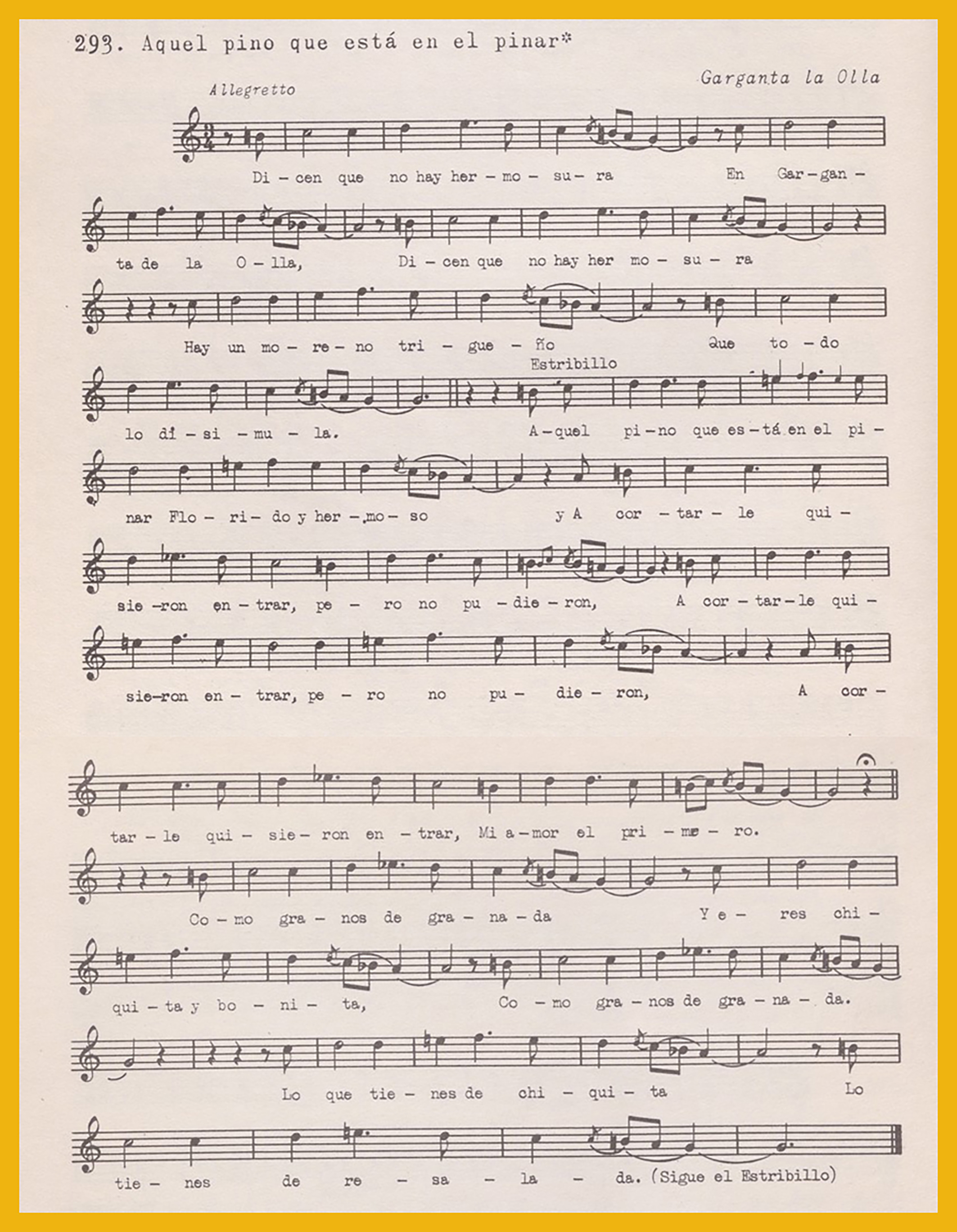 Ref. Partitura transcripción Kurt Schindler (1941): A. «Aquel pino que está en el pinar», registro número 293. B. «El trébole verato», registro número 291. «Saca el jarro», registro número 290