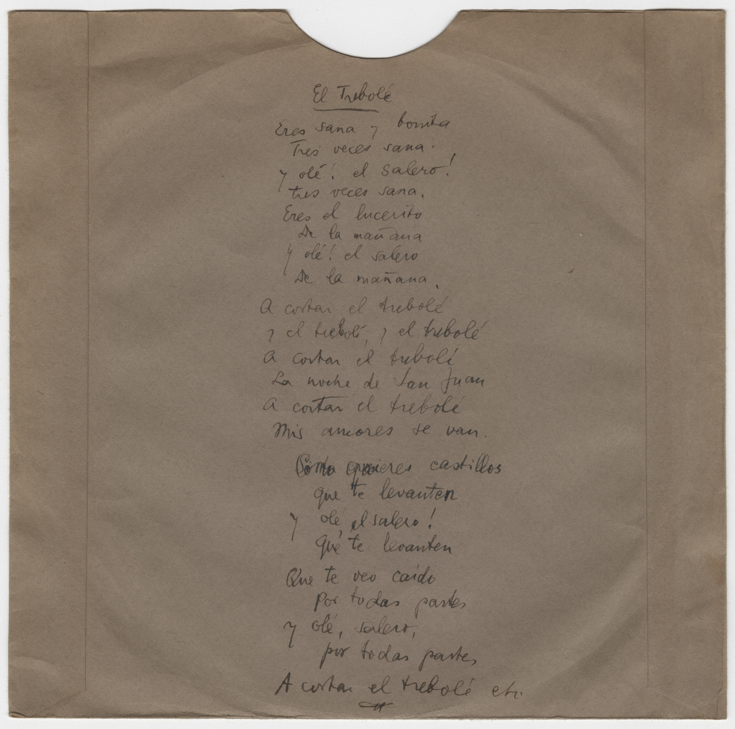 Descripción física: Disco de aluminio. Lleva anotados los títulos de las canciones en la pegatina del disco. La carátula está manuscrita: Garganta de la Olla I. Títulos y letra de las canciones.
