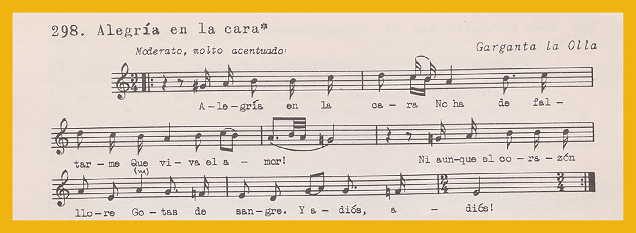 Ref. Partitura transcripción Kurt Schindler (1941): A. «Arenal de Sevilla» y «Canción de Toros» con el íncipit: «Alegría en la cara», registro número 298. B. «Si yo fuera dorador», registro número 292. «Esta calle la rondan los mozos» aparece en los registros como : «A tu puerta puse un guindo», registro número 294