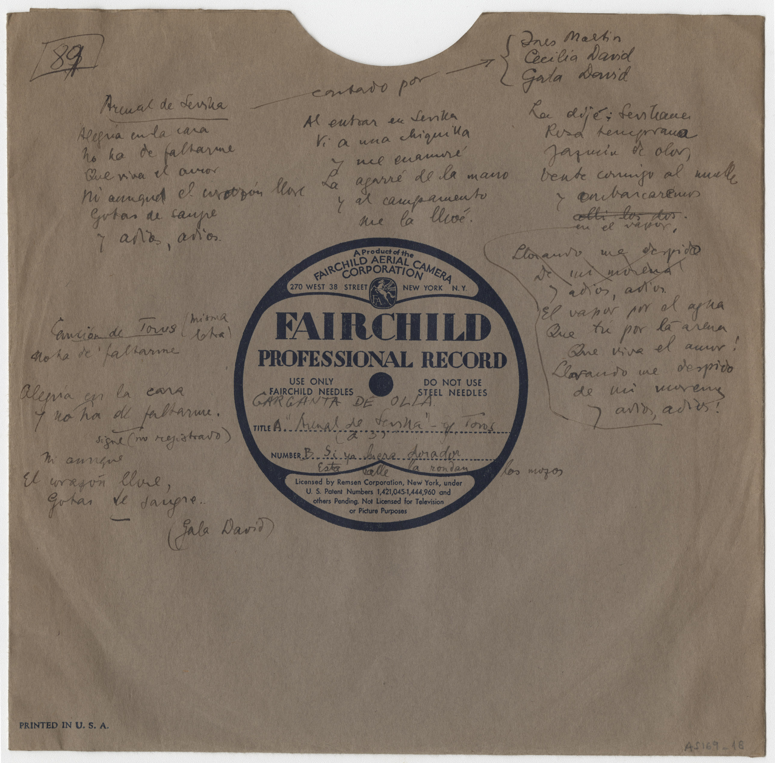Descripción física: Disco de aluminio. Lleva anotados el lugar y los títulos de las canciones en la etiqueta del disco. En el sobre lleva manuscrito, además, la letra de las canciones.