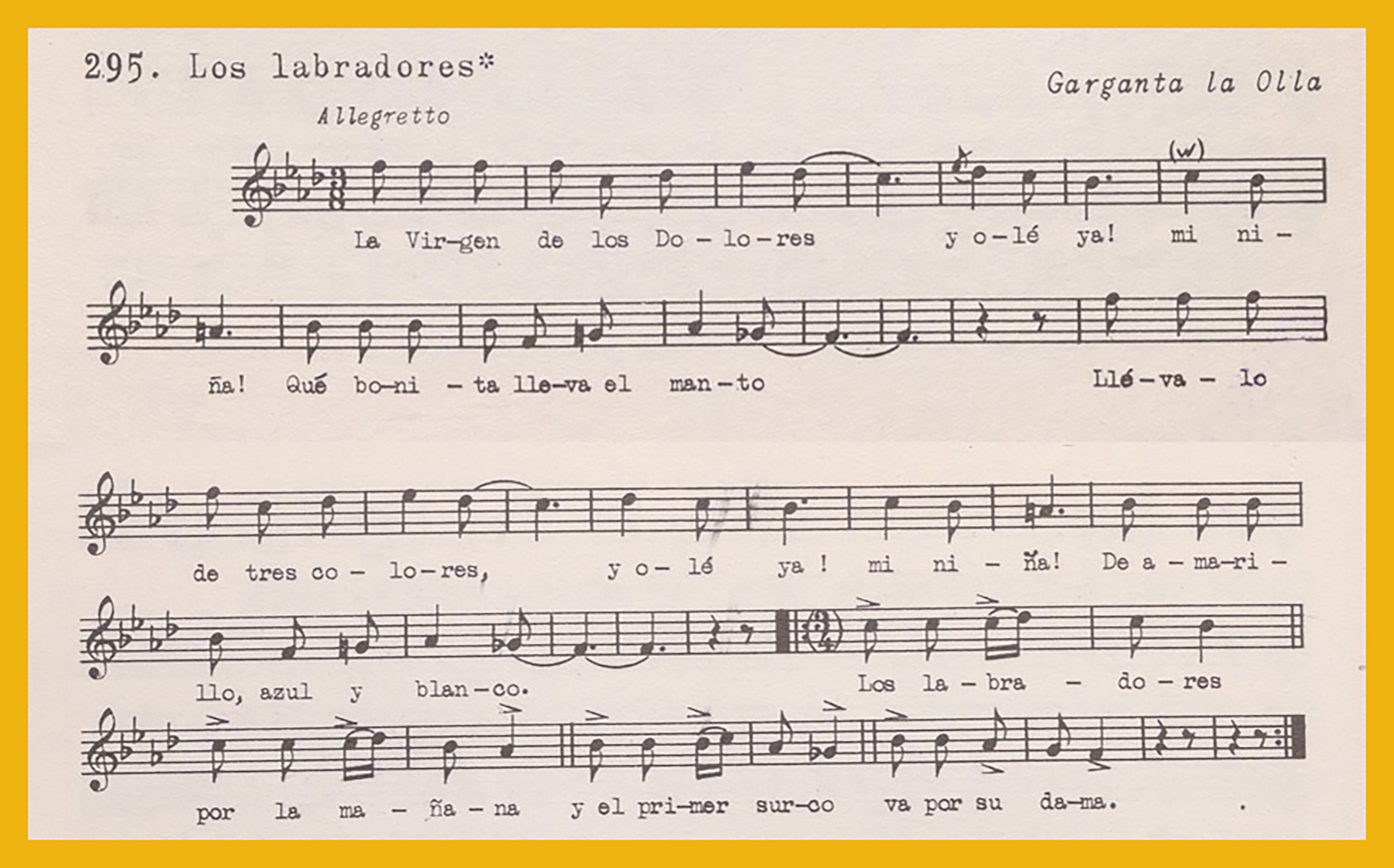 Ref. Partitura transcripción Kurt Schindler (1941): A. «Los labradores» registro número 295. «Llena de pena, María» registro número 296