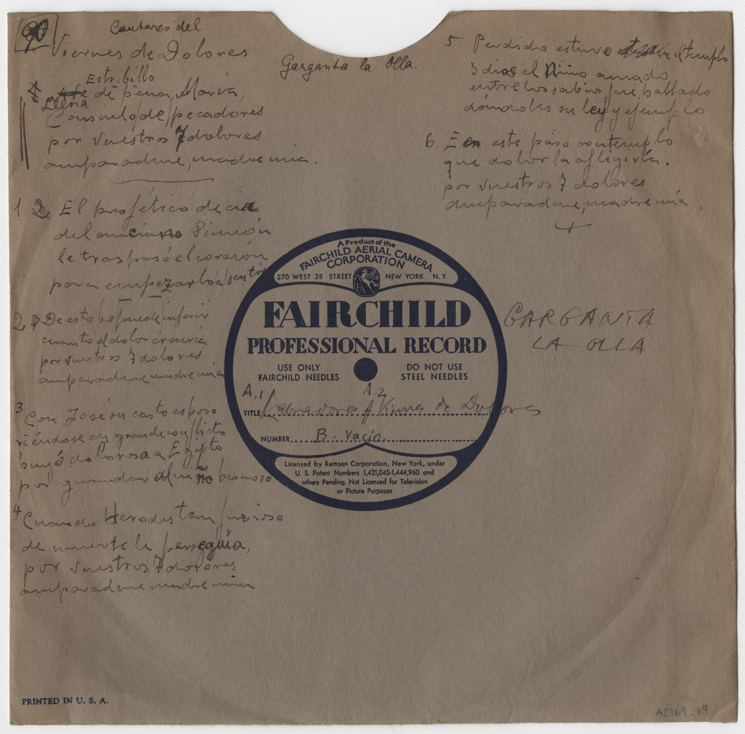 Descripción física: Disco de aluminio. Lleva anotados el lugar y los títulos de las canciones en la etiqueta. En el sobre manuscrito: Garganta de la Olla, títulos y letra de las canciones.