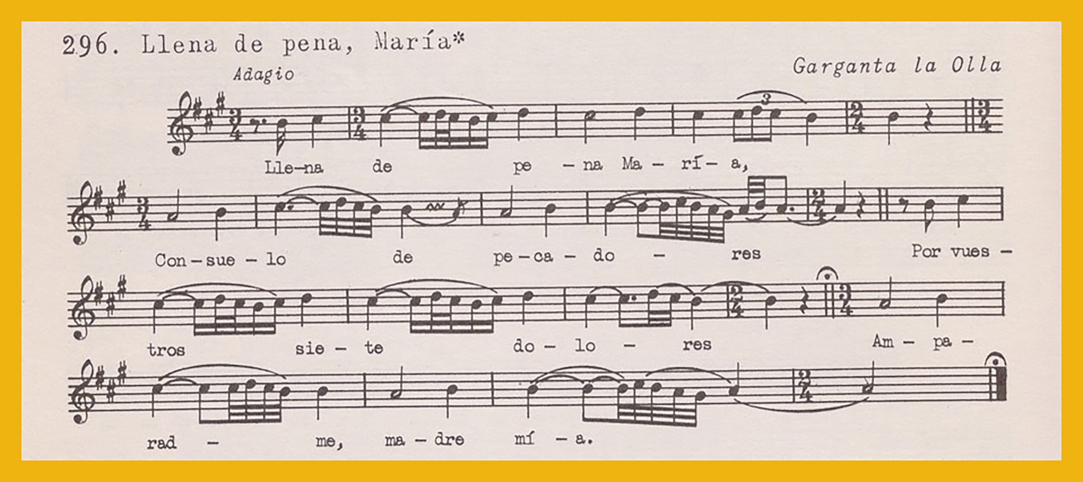 Ref. Partitura transcripción Kurt Schindler (1941): A. «Los labradores» registro número 295. «Llena de pena, María» registro número 296