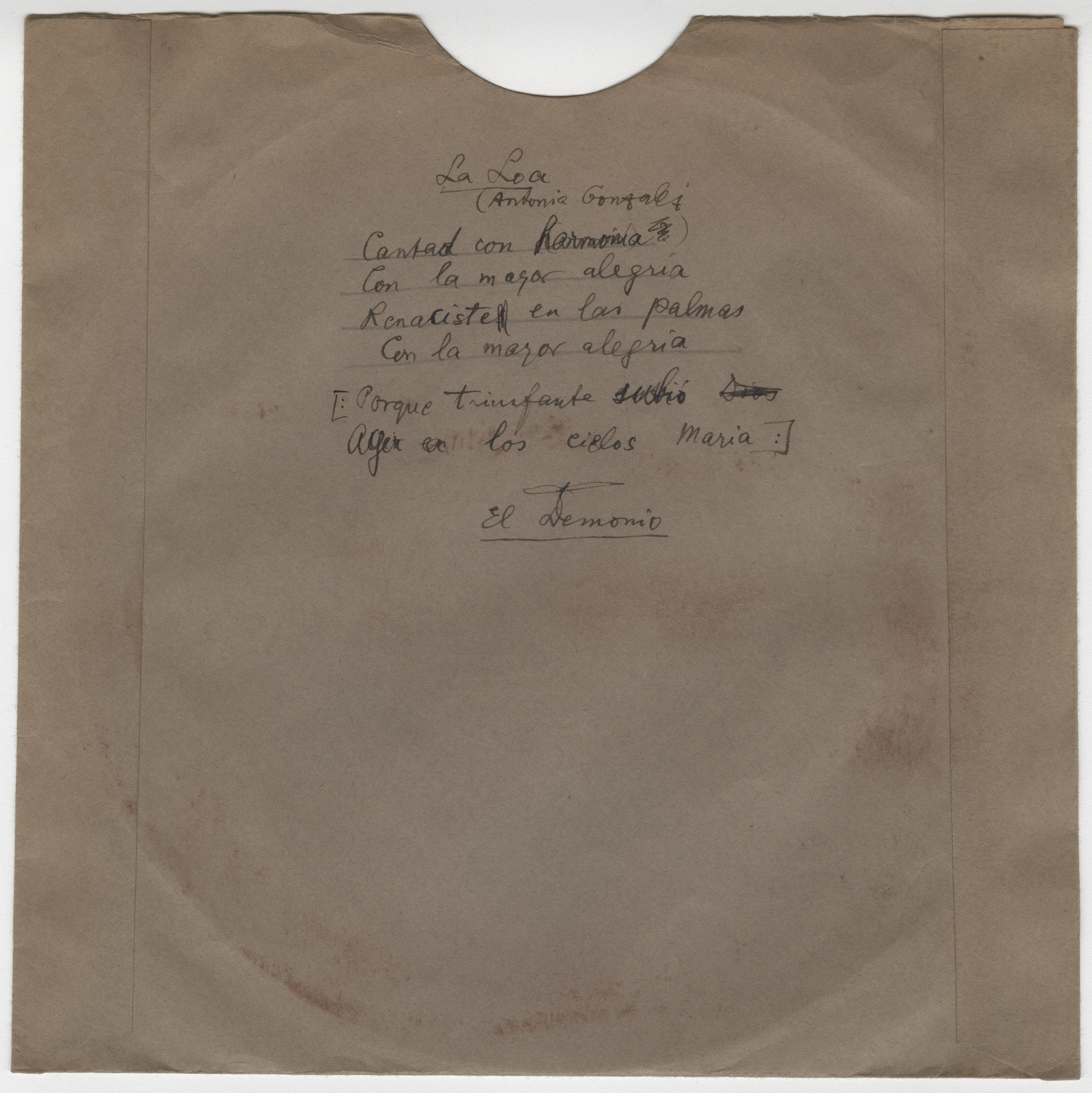 Descripción física: Disco de aluminio. En la etiqueta del disco lleva manuscritos el lugar y los títulos Cantos de Santa Águeda y bodas; ; y Loa. En el sobre lleva como títulos Alborada de Santa Águeda (5 de febrero) y bodas y La loa. Incluye la letra de las canciones y la intérprete Antonia González