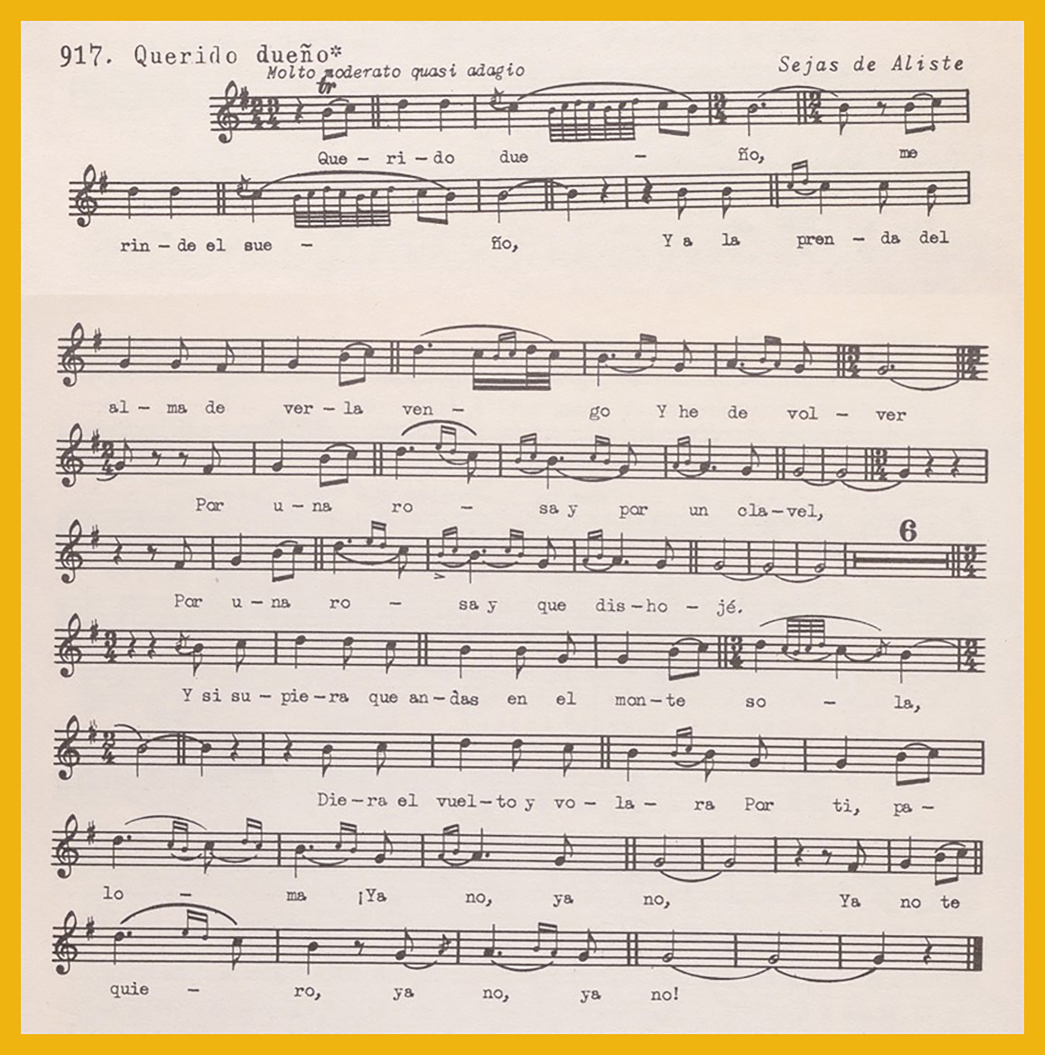 Ref. Partitura transcripción Kurt Schindler (1941): A. «Querido dueño», registro número 917. B. «La Rueca», registro número 918. «Esta noche no es noche», registro número 919