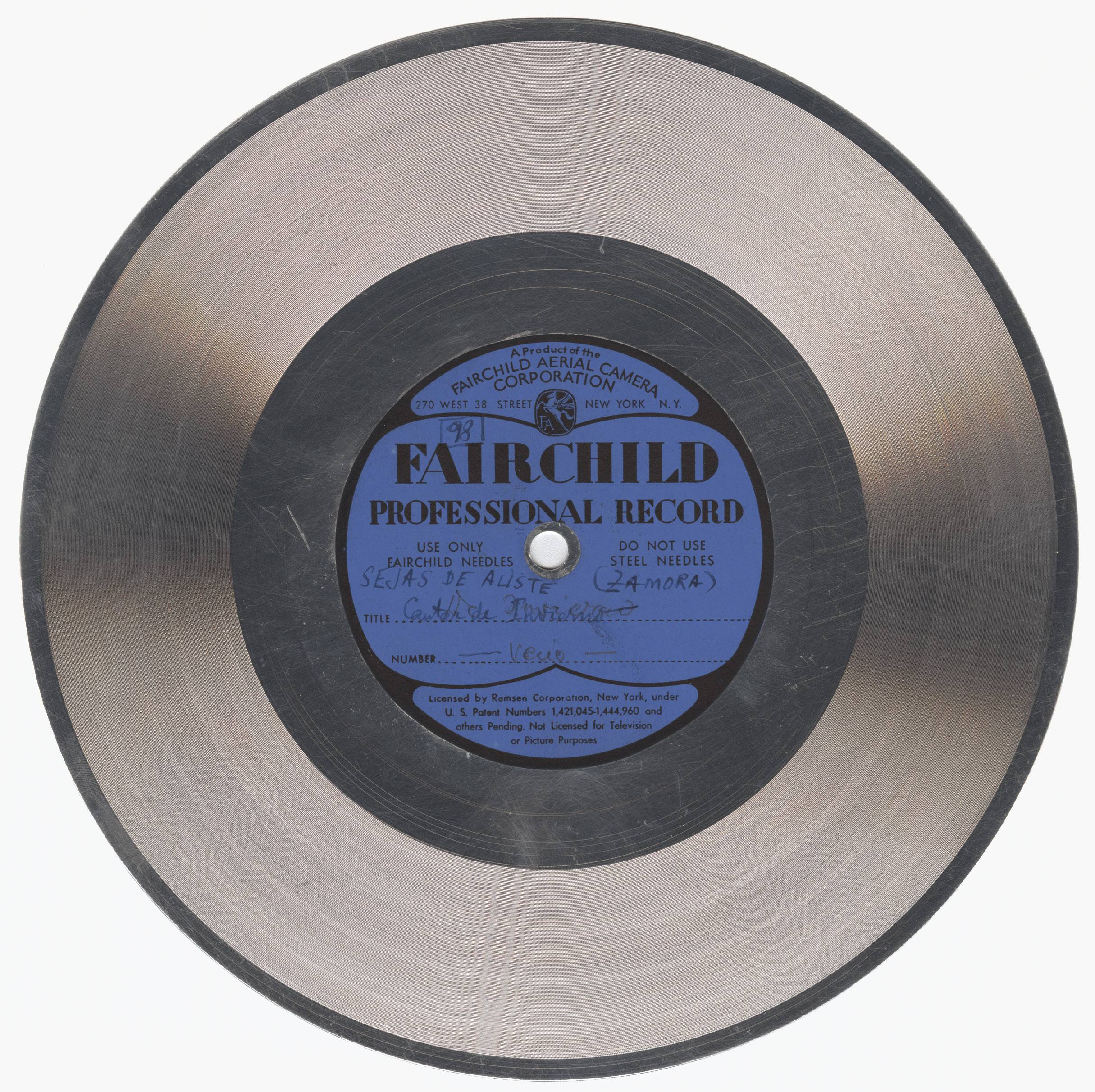 Descripción física: Disco de aluminio. En la etiqueta del disco lleva manuscritos el lugar y el título y en el sobre lleva la letra de la canción.