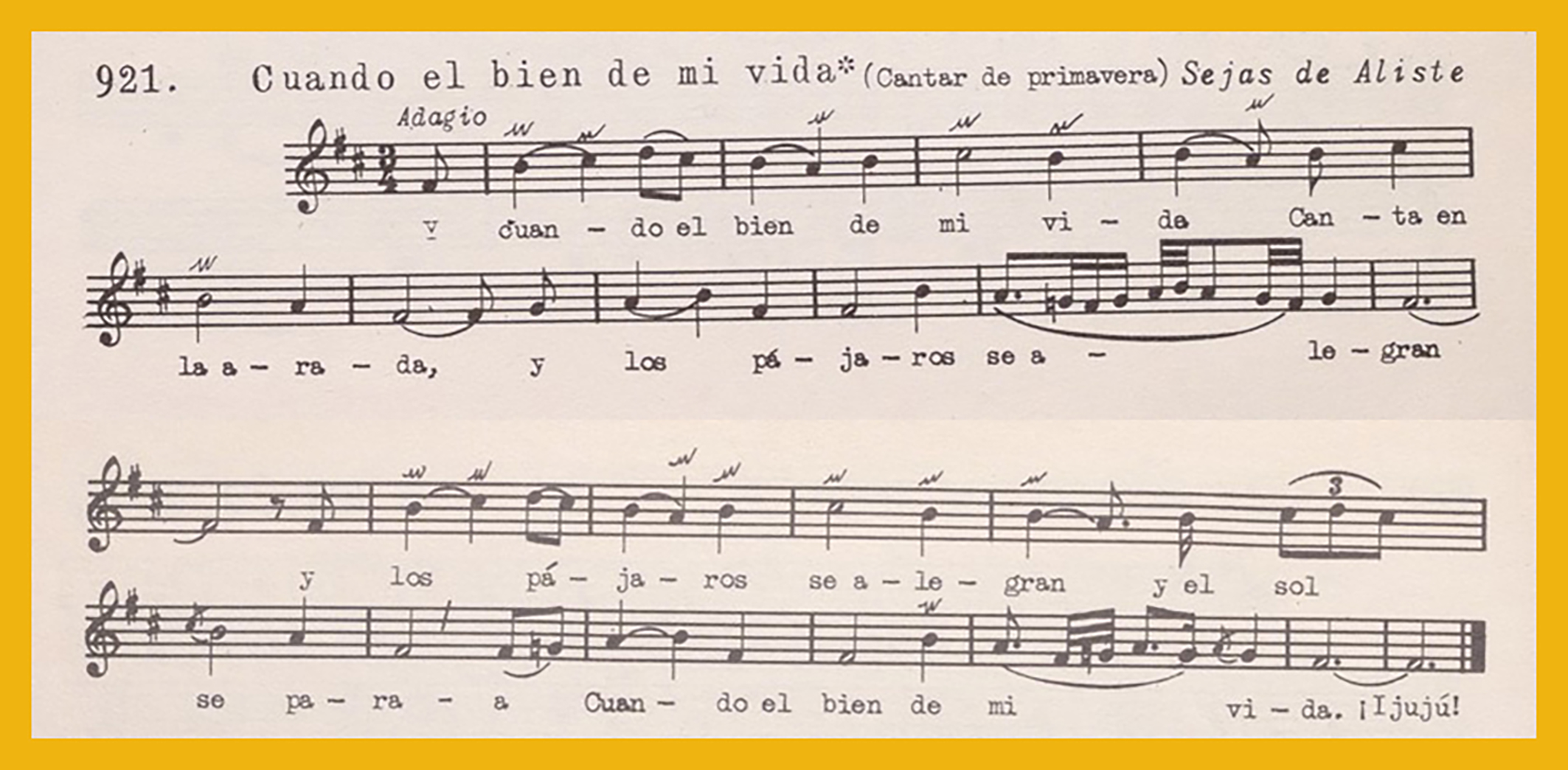 Ref. Partitura transcripción Kurt Schindler (1941): A. «Cuando el bien de mi vida (cantar de primavera», registro número 921. «A la sombra del tejado», registro número 922. B. «De ventana en ventana», registro número 923. «Estrella», registro número 924