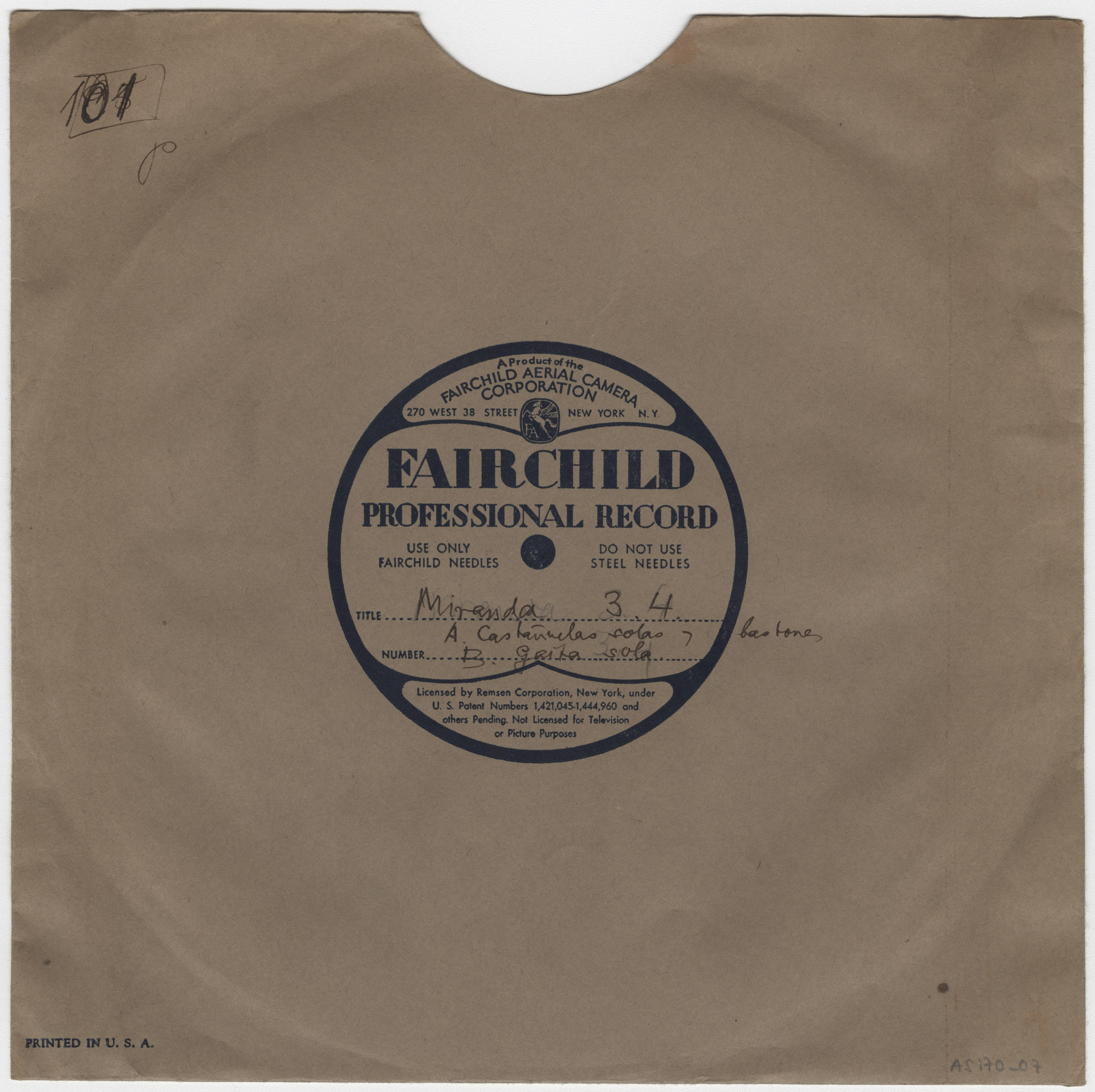 Descripción física: Disco de aluminio. En la etiqueta del disco lleva manuscritos el lugar y los títulos al igual que en el sobre. Aunque está identificado como Miranda se trata de la localidad portuguesa de Miranda Do Douro lindando con la provincia de Zamora.