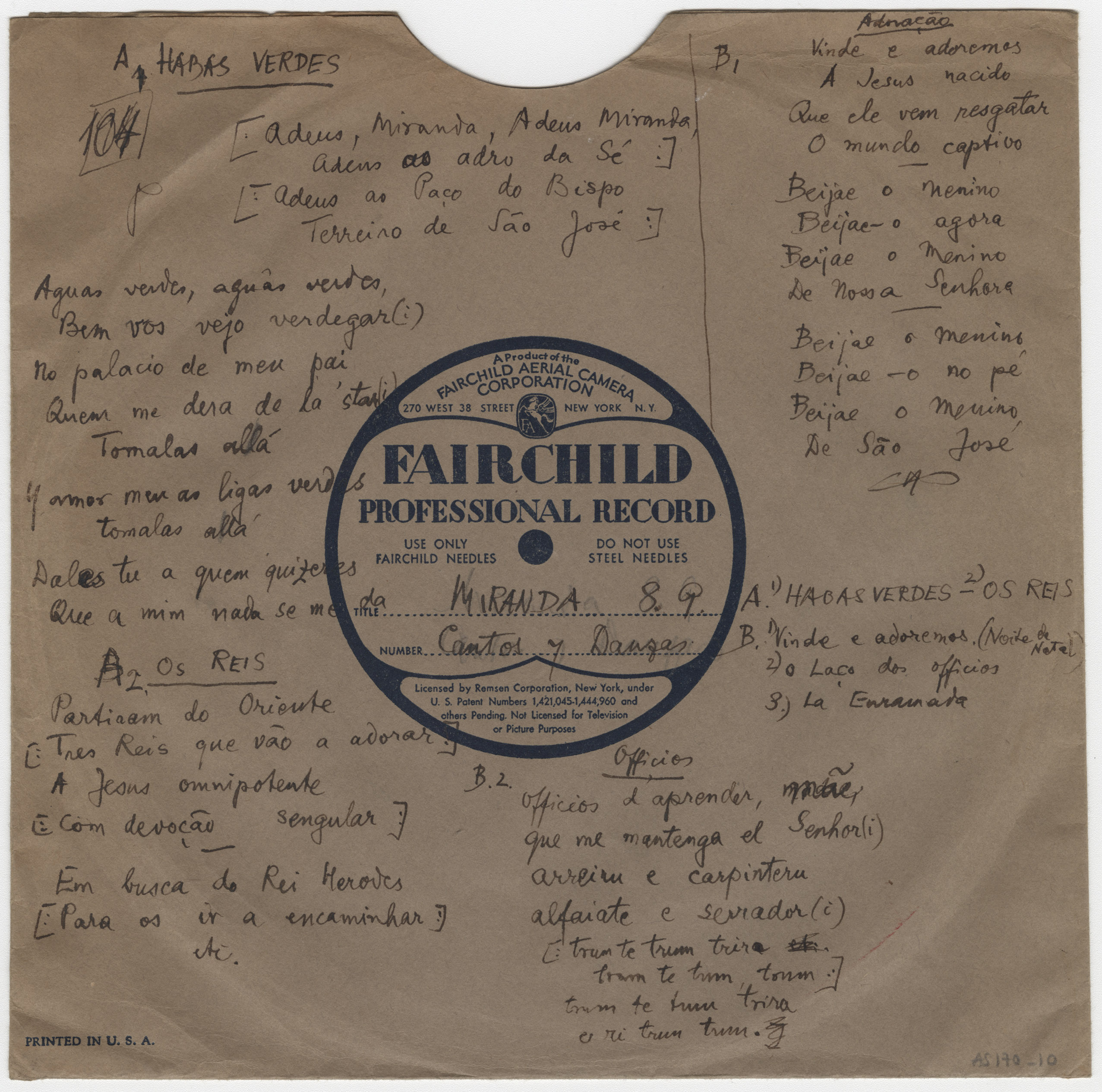 Descripción física: Disco de aluminio. En la etiqueta del disco lleva manuscritos el lugar y los títulos. En el sobre lleva, además, la letra de las canciones. Aunque está identificado como Miranda se trata de la localidad portuguesa de Miranda Do Douro lindando con la provincia de Zamora.