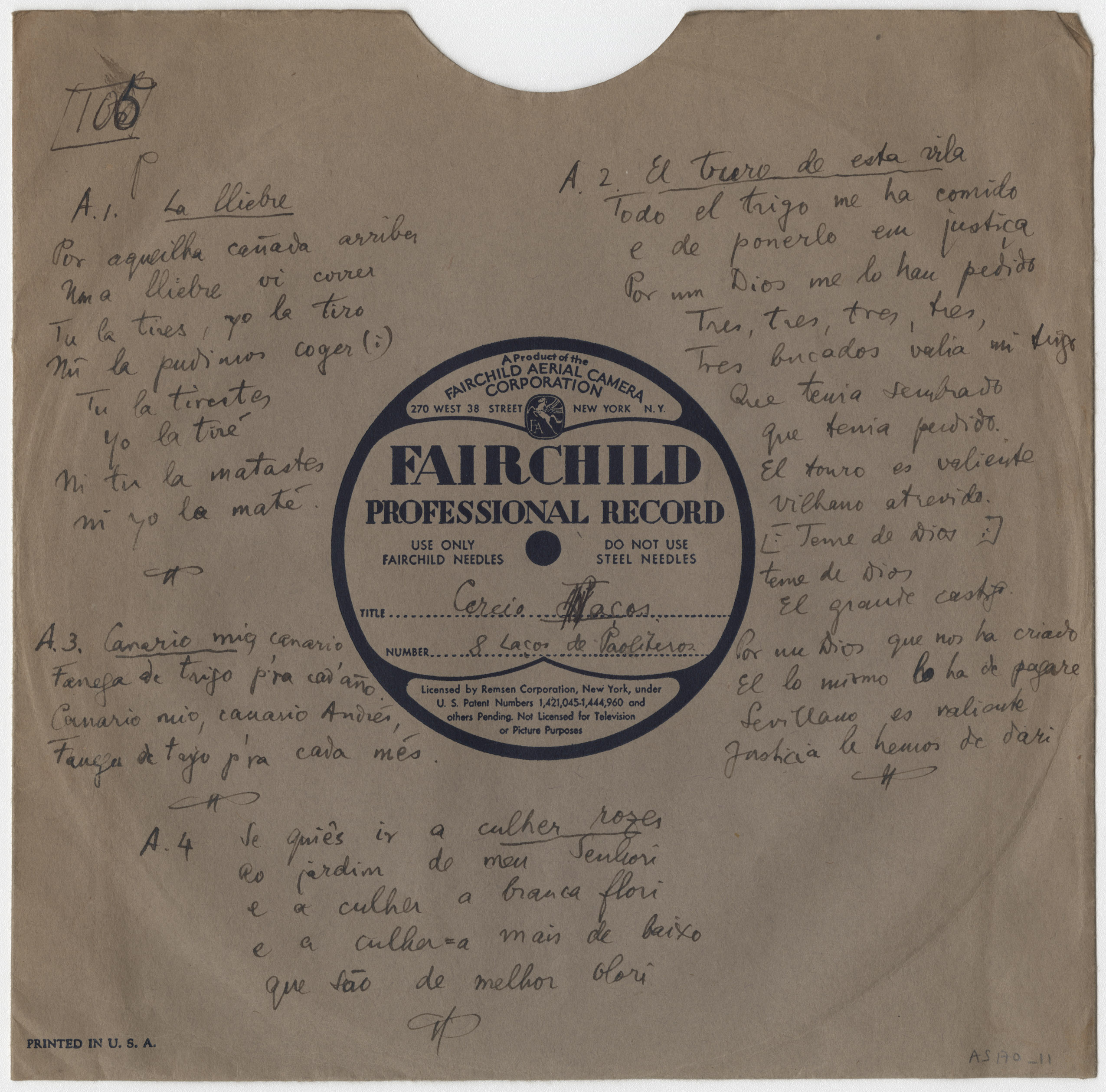Descripción física: Disco de aluminio. En la etiqueta del disco lleva manuscritos el lugar y los títulos. En el sobre lleva, además, la letra de las canciones. Cércio pertenece a Miranda Do Douro, una localidad portuguesa que linda con la provincia de Zamora.