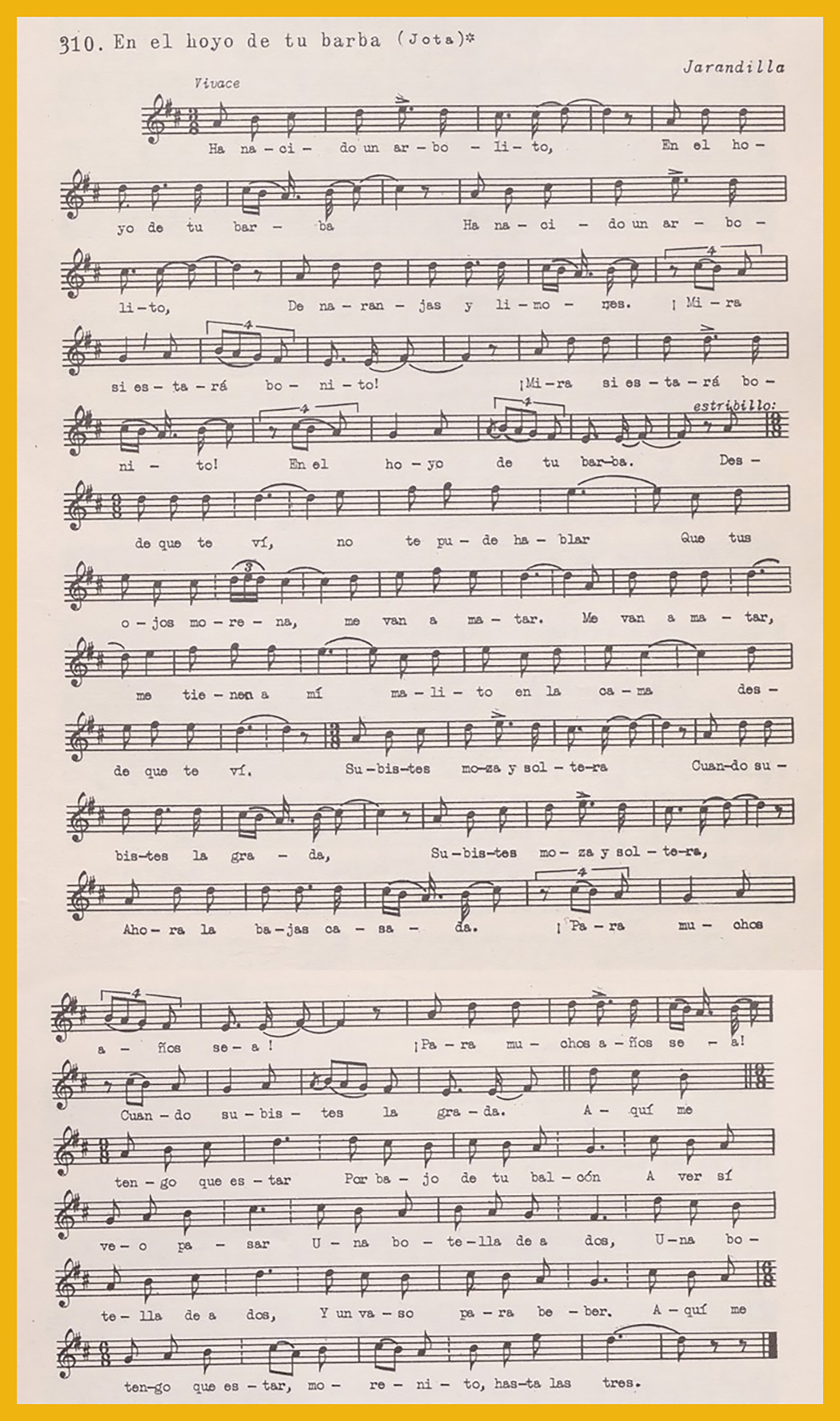 Ref. Partitura transcripción Kurt Schindler (1941):.A. Aparece como «La vi llorando», registro número 307. «Aquí me tienes torito», registro número 308. «A la rueda dela patata», registro número 309. B. «En el hoyo de tu barba (jota)», registro nº 310. «Tiende los pañuelitos (juego de niñas)», registro nº 311
