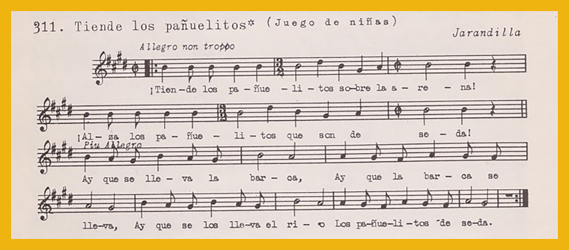 Ref. Partitura transcripción Kurt Schindler (1941):.A. Aparece como «La vi llorando», registro número 307. «Aquí me tienes torito», registro número 308. «A la rueda dela patata», registro número 309. B. «En el hoyo de tu barba (jota)», registro nº 310. «Tiende los pañuelitos (juego de niñas)», registro nº 311