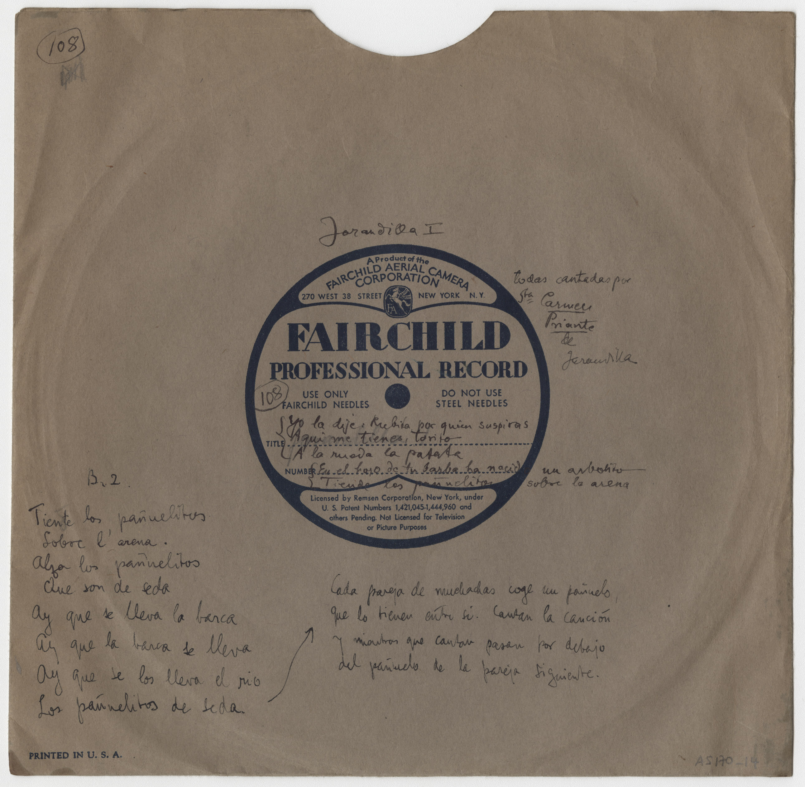 Descripción física: Disco de aluminio. Lleva anotados los títulos de las canciones en la etiqueta del disco. En el sobre manuscrito: Jarandilla I. Títulos, intérprete, Sta. Carmen Priante, y letra de las canciones.