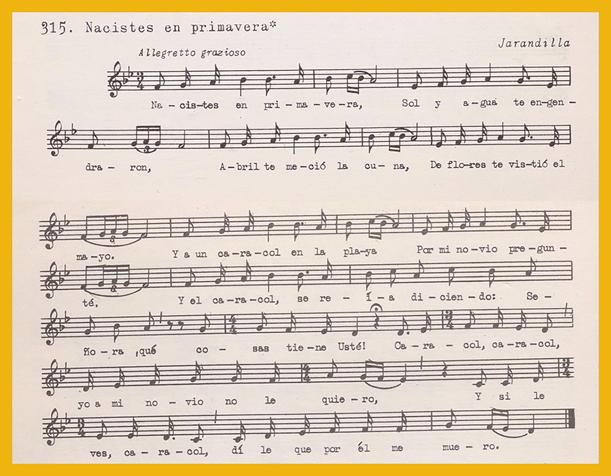 Ref. Partitura transcripción Kurt Schindler (1941): A. «Madre, a la puerta hay un niño», registro número 312. «La primera entradita del amor», registro número 313. B.«Virgen de la Concepción», registro nº 314. «Nacistes en primavera», registro nº 315
