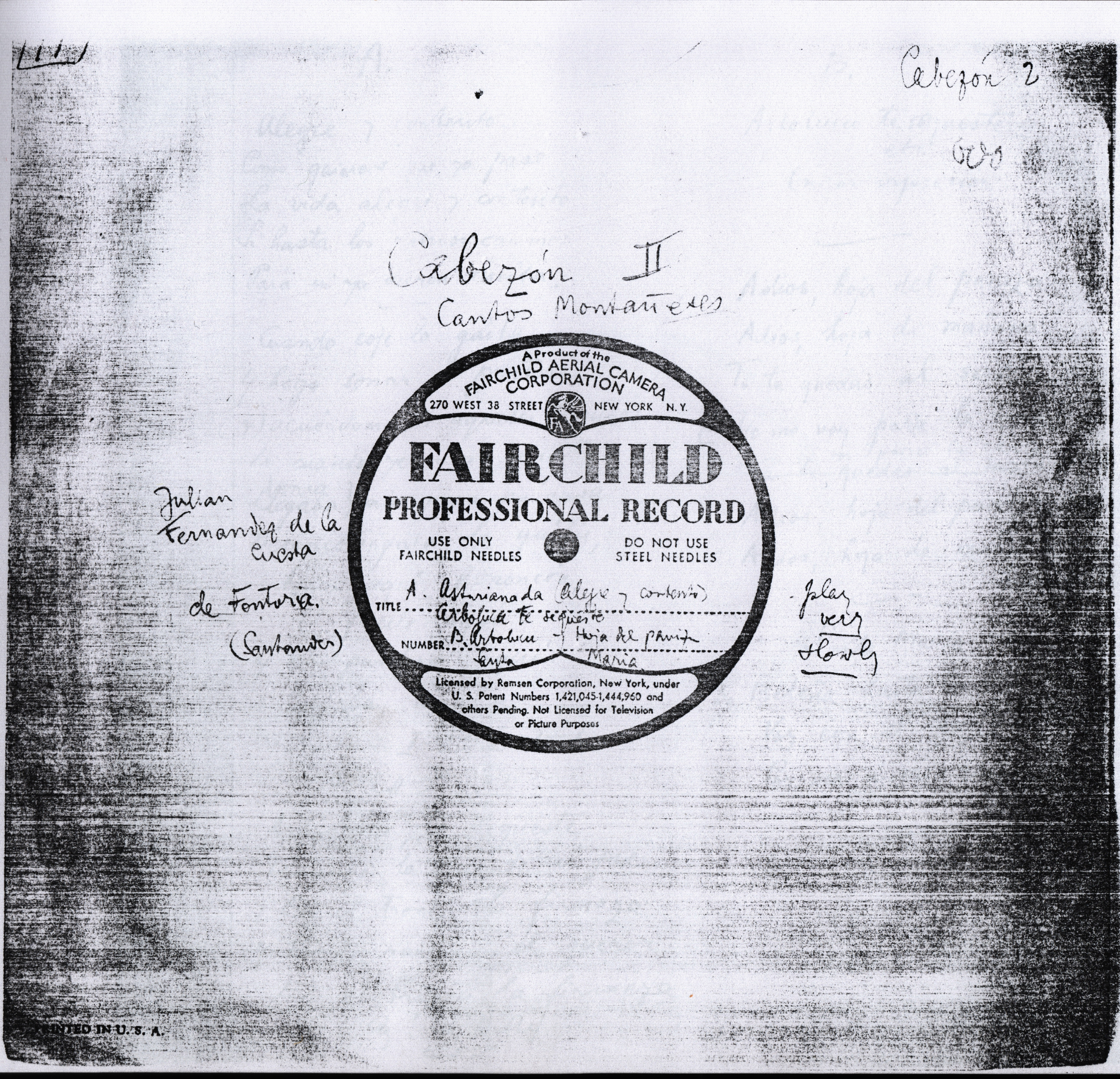 Descripción física: Disco de aluminio. Anotaciones manuscritas en el sobre " Play very slowly" , nombre del intérprete, Julián Fernández de la Cuesta de Fontoria (Santander) y letra de las canciones.