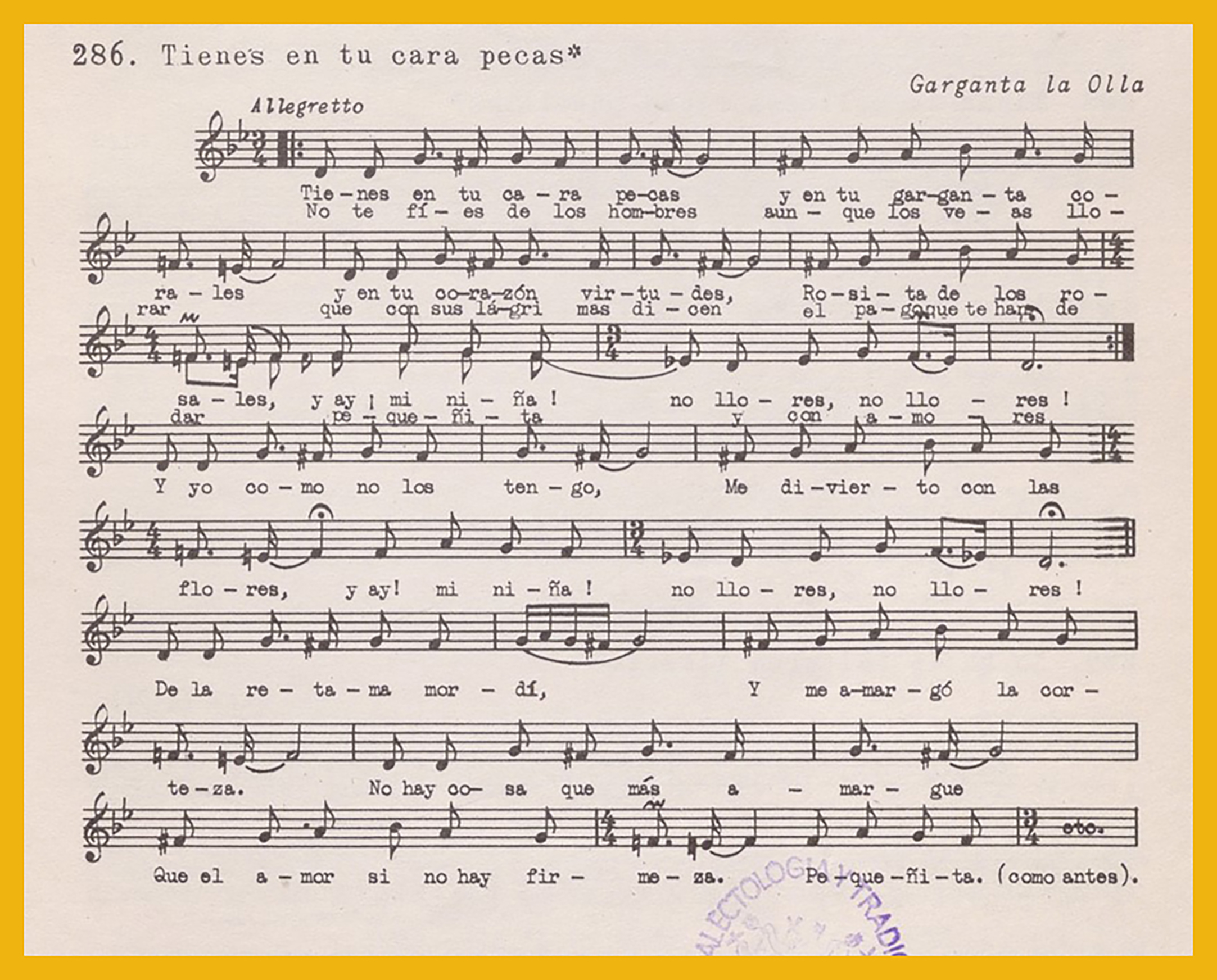 Ref. Partitura transcripción Kurt Schindler (1941): A. Ay chiquitita no llores aparece como «Tienes en tu cara pecas», registro número 286. Canción de Quintos «Adiós, calle del chorrillo (jota)», registro número 287. B. «Tiene la molinera ricas puntillas», registro número 288.