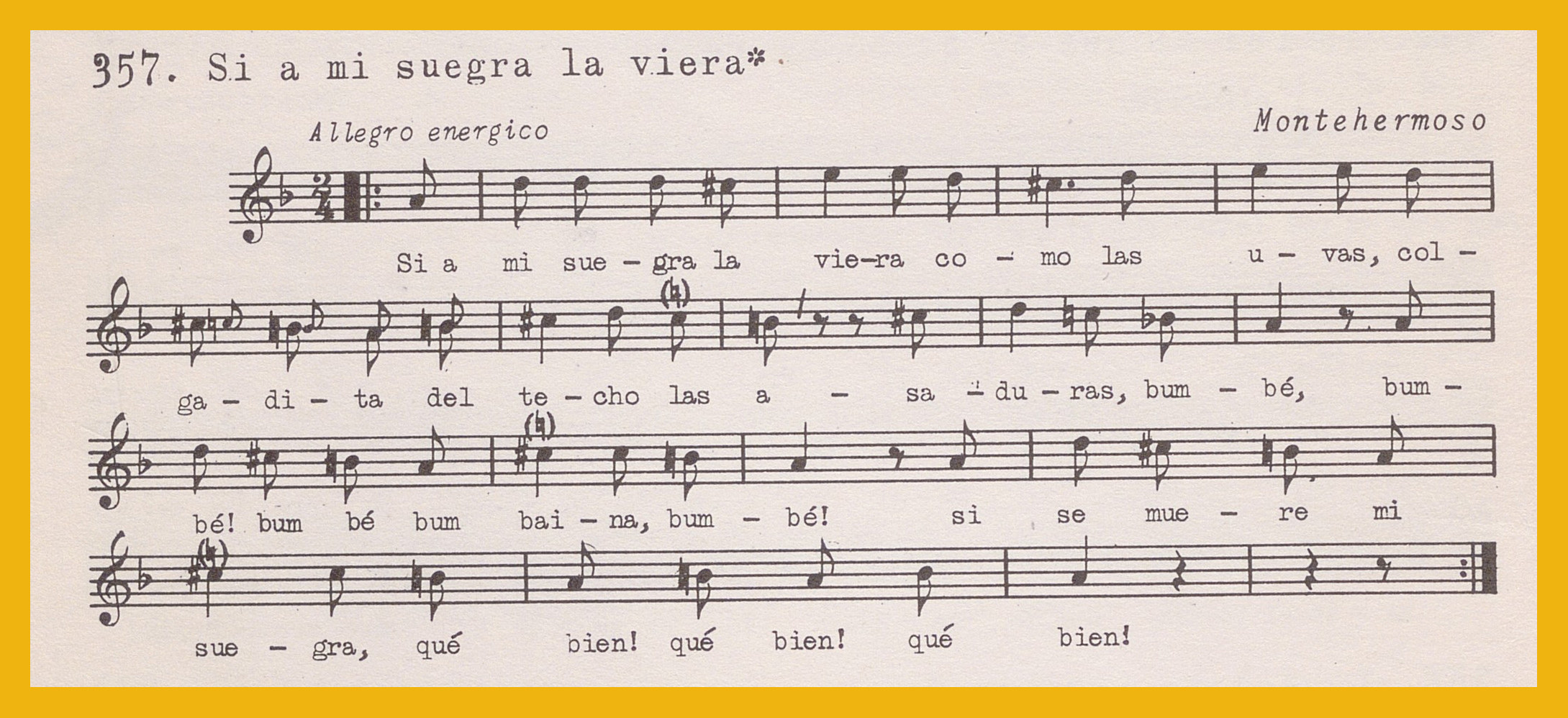 Ref. Partitura transcripción Kurt Schindler (1941): A: «Yo fui el que te quité el pollo» en el registro 354.«Levántate, morenita» en el registro 355.«Y un limón tiré a rodar» en el registro 356.«Si a mi suegra la viera» en el registro 357.«Estaba la molinera» en el registro 359