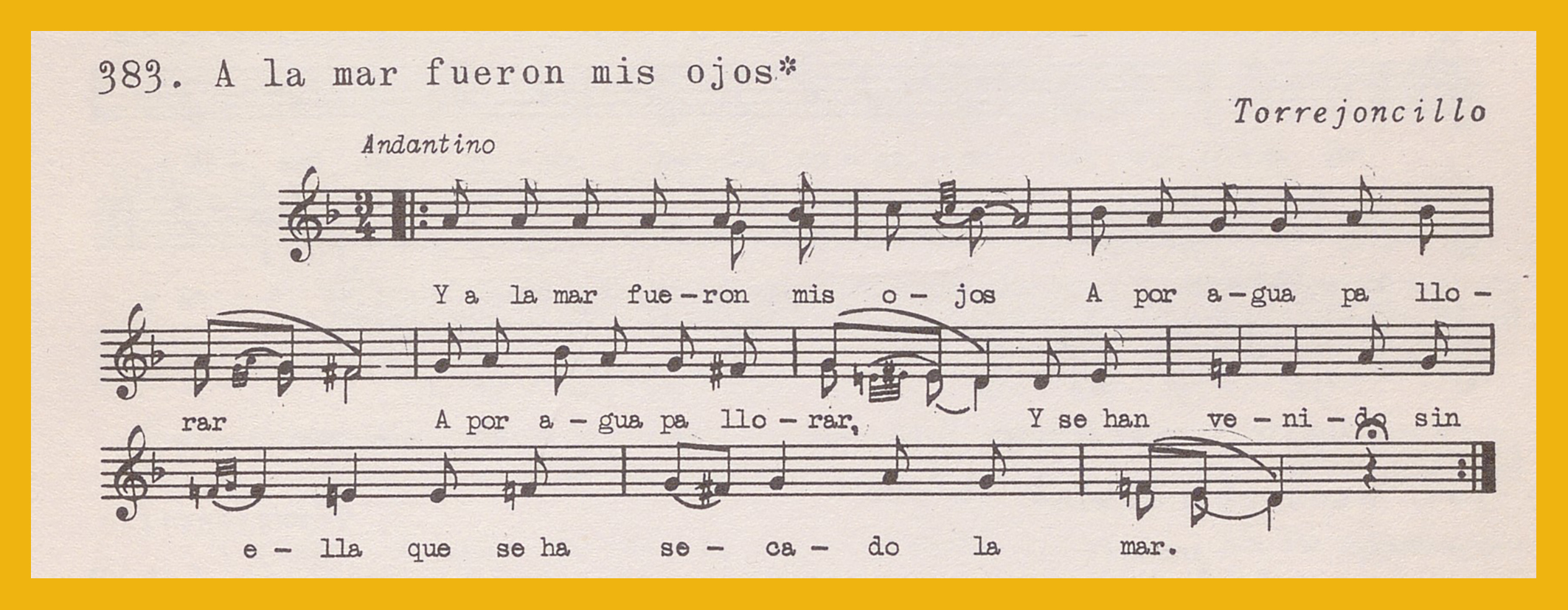 Ref. Partitura transcripción Kurt Schindler (1941): A: «El Caldererillo» en el registro 378.«La primera visita del amor» en el registro 379.«En esta calle vivía» en el registro 380. B. «El pino en el pinar» en el registro 381.«A la mar fueron mis ojos» en el registro 383