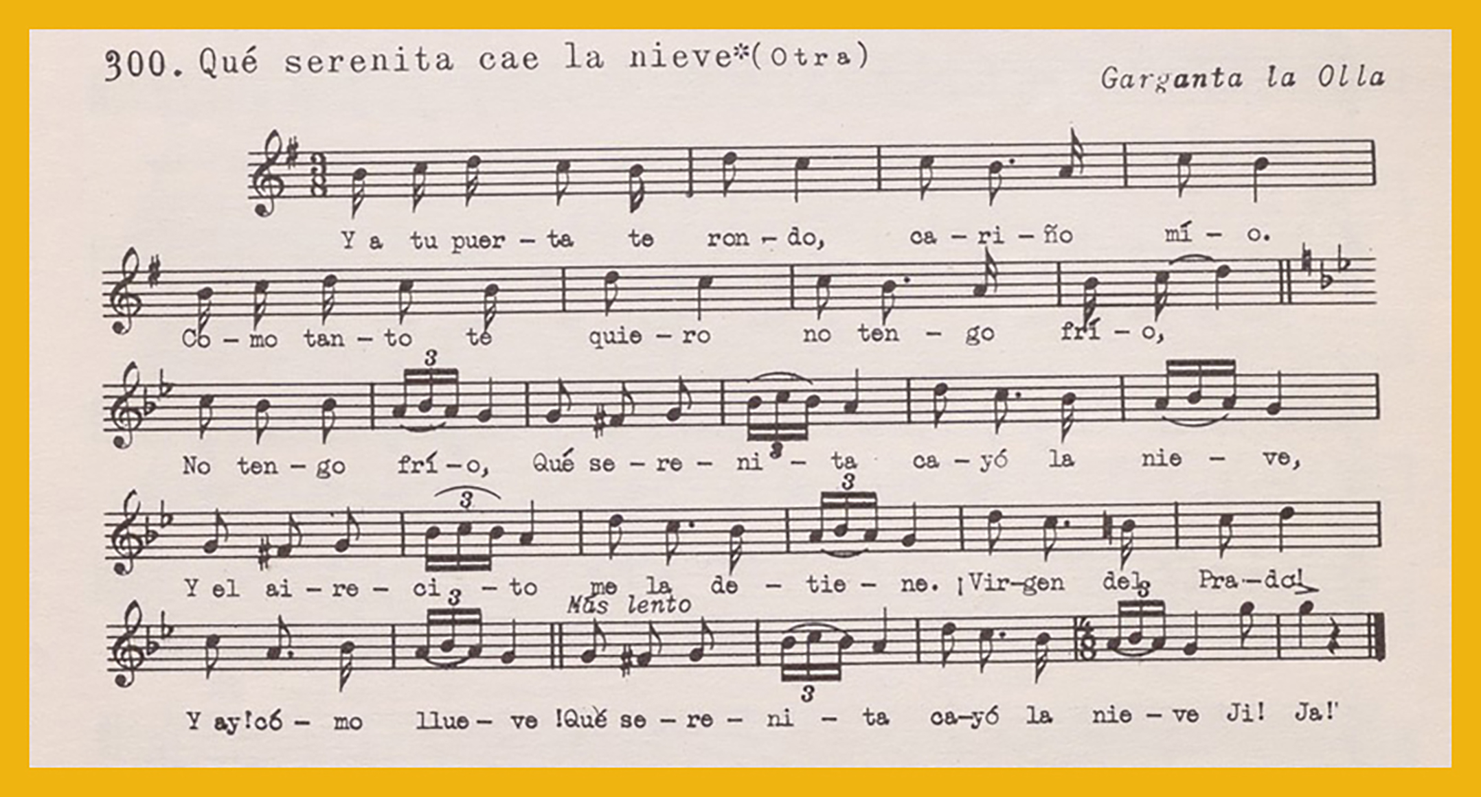Ref. Partitura transcripción Kurt Schindler (1941): A: «Qué serenita cae la nieve» en el registro 300 y 301. B: «No te acuerdas cuando andabas» en el registro 343.«Se han cavado las viñas» en el registro 234