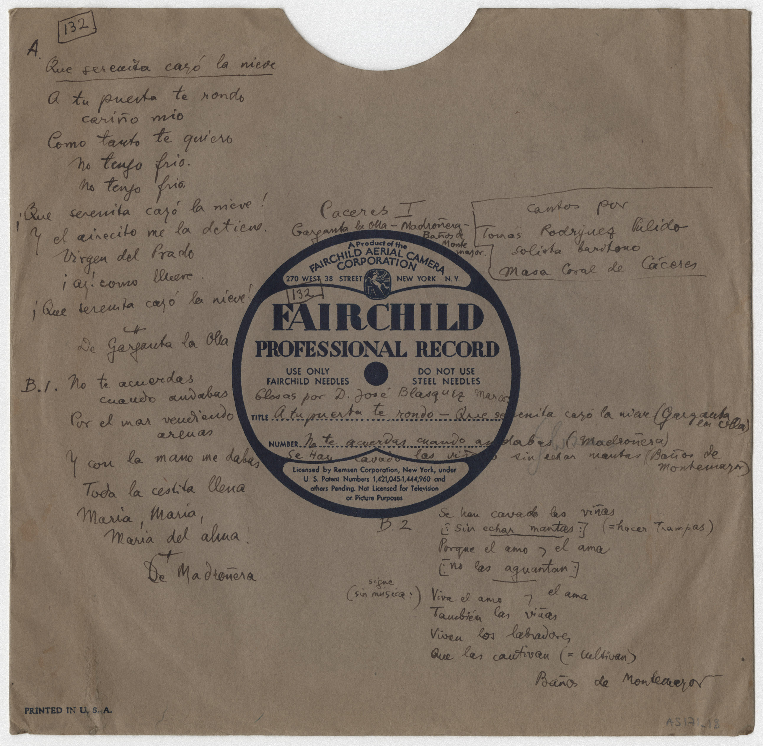 Descripción física: Disco de aluminio. En la pegatina del disco lleva anotados los lugares, los títulos y los intérpretes: Con glosas de D. José Blázquez cantadas por Tomás Rodríguez Pulido, solista barítono y la Masa coral de Cáceres. La carátula lleva, además, los lugares y las letras.